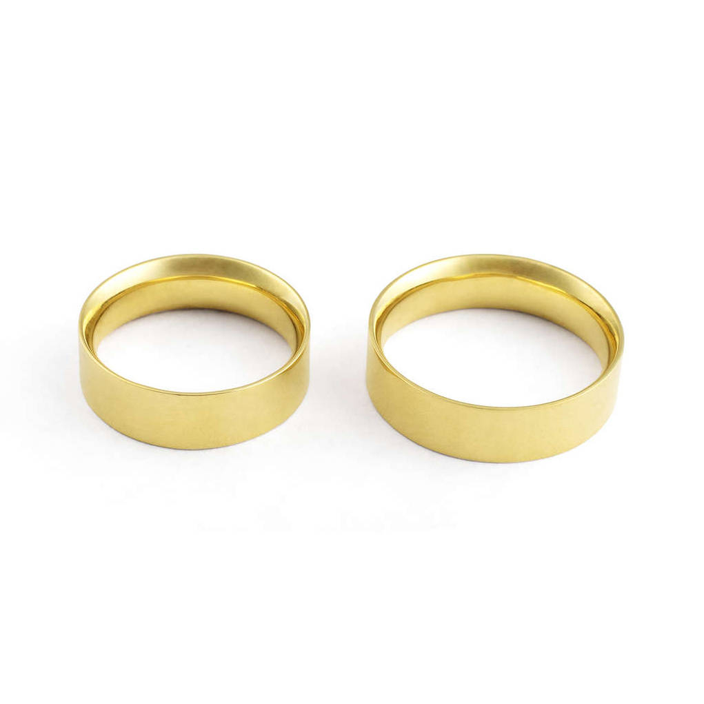 Aliança ouro amarelo reta anatômica, reta por fora e abaulada por dentro com largura de 6 milímetros
