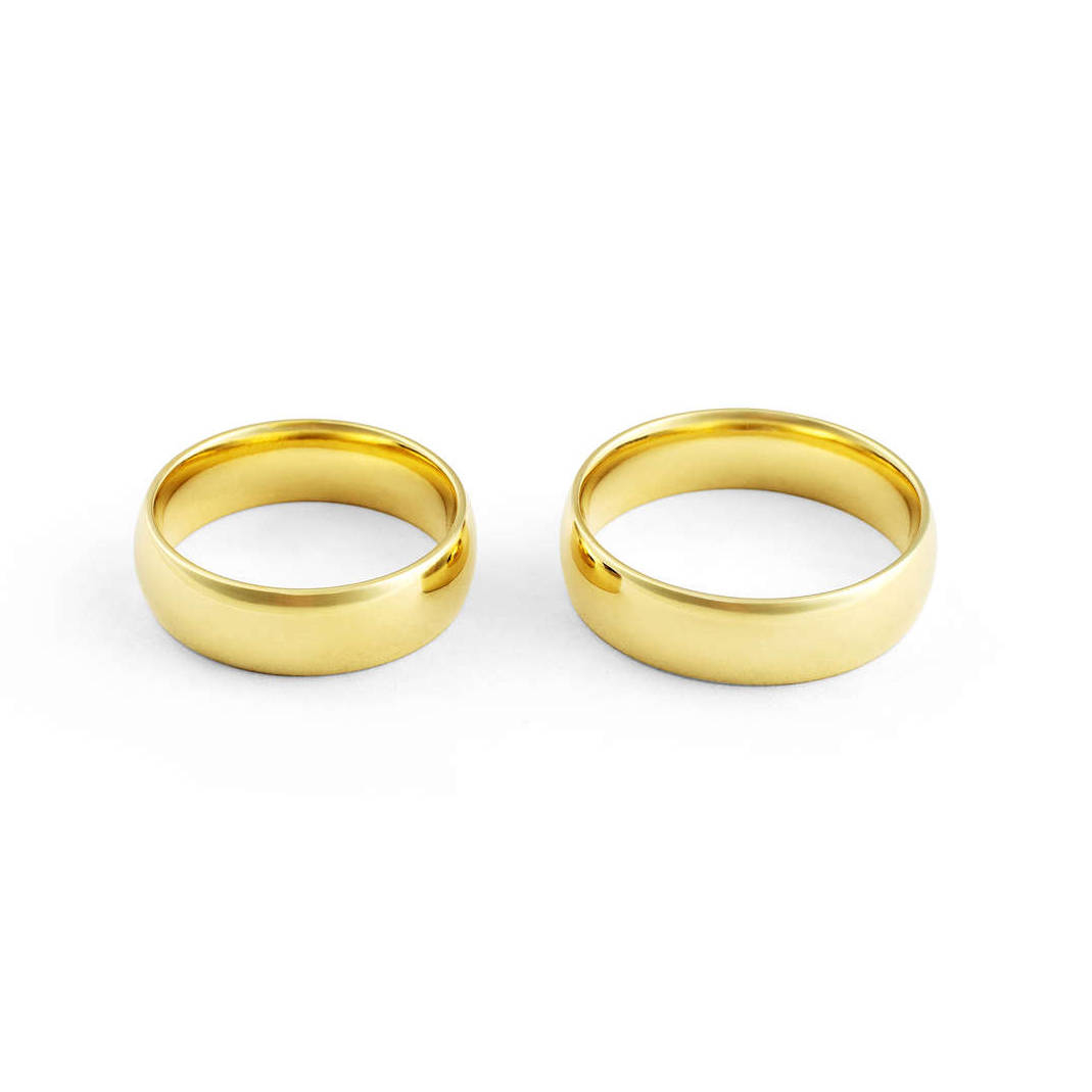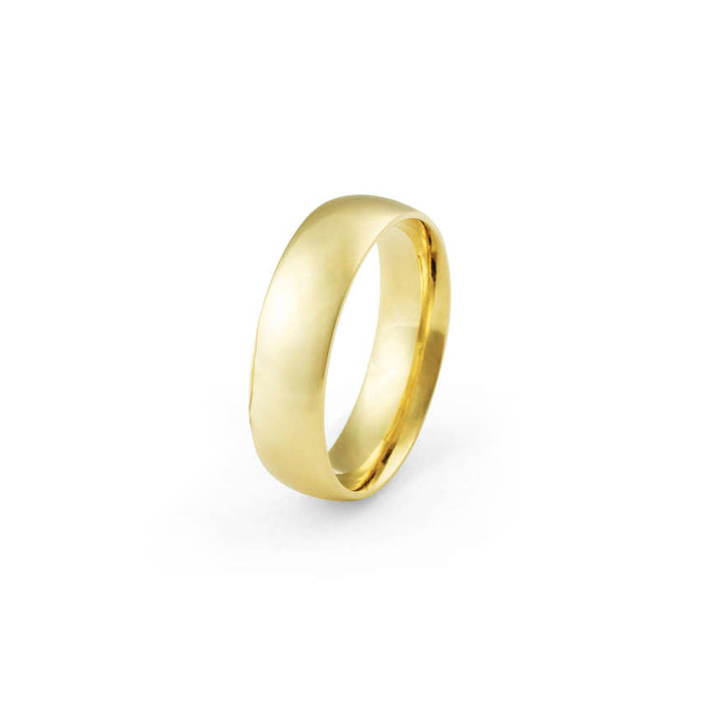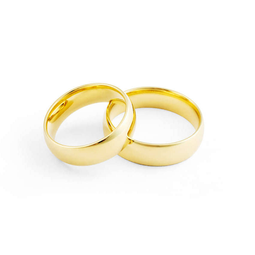 Aliança ouro amarelo anatômica, abaulada por fora e reta por dentro, com largura de 6 milímetros