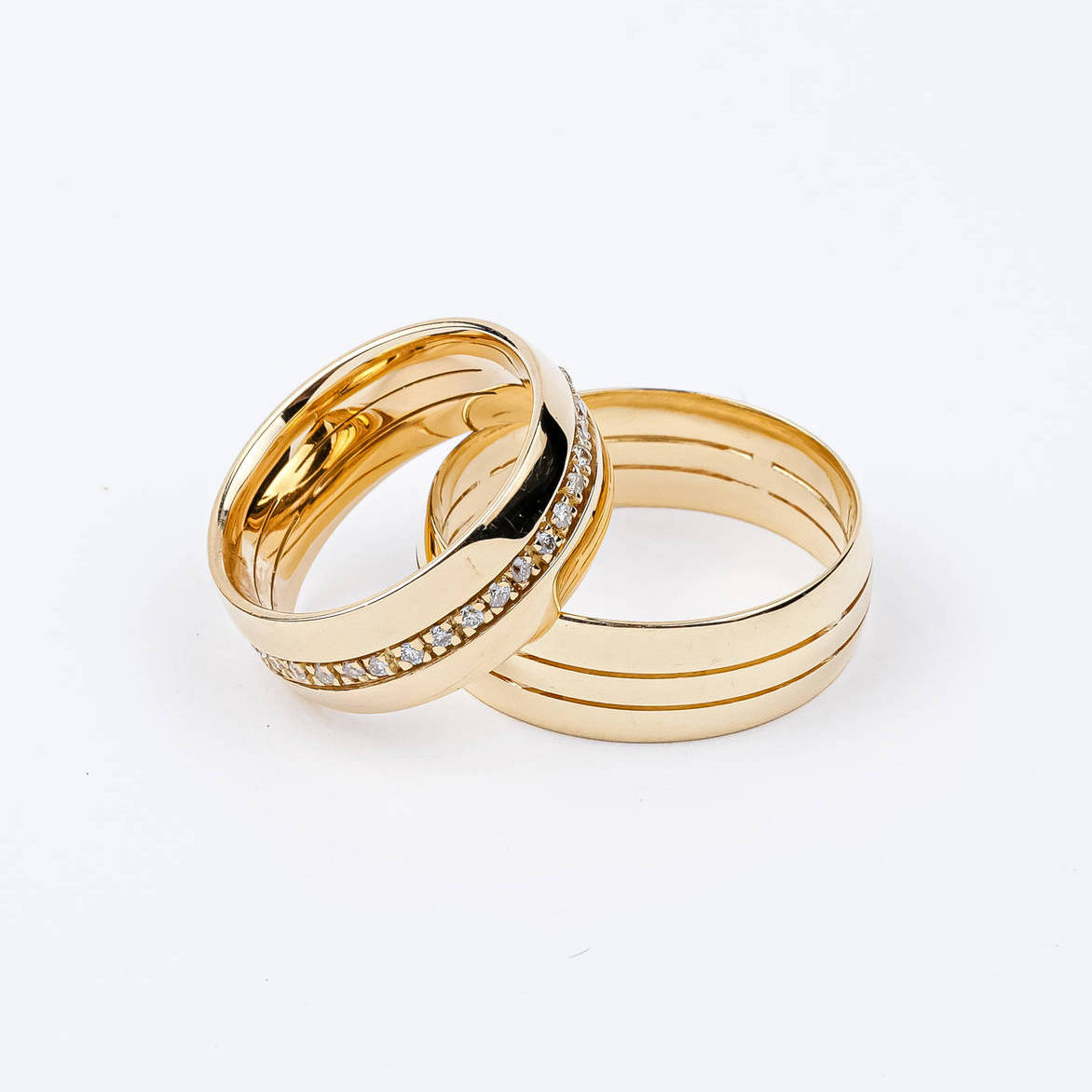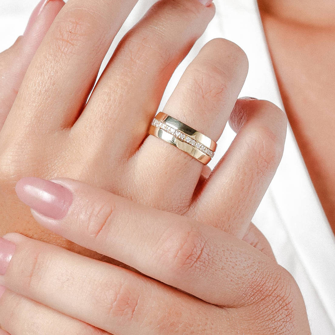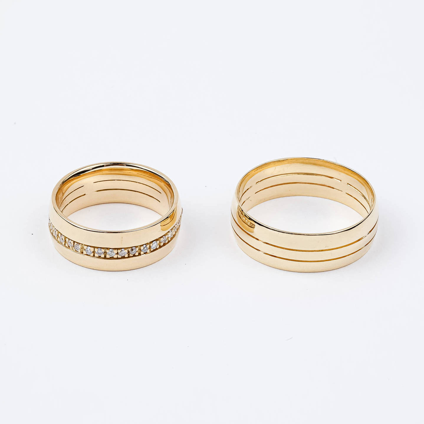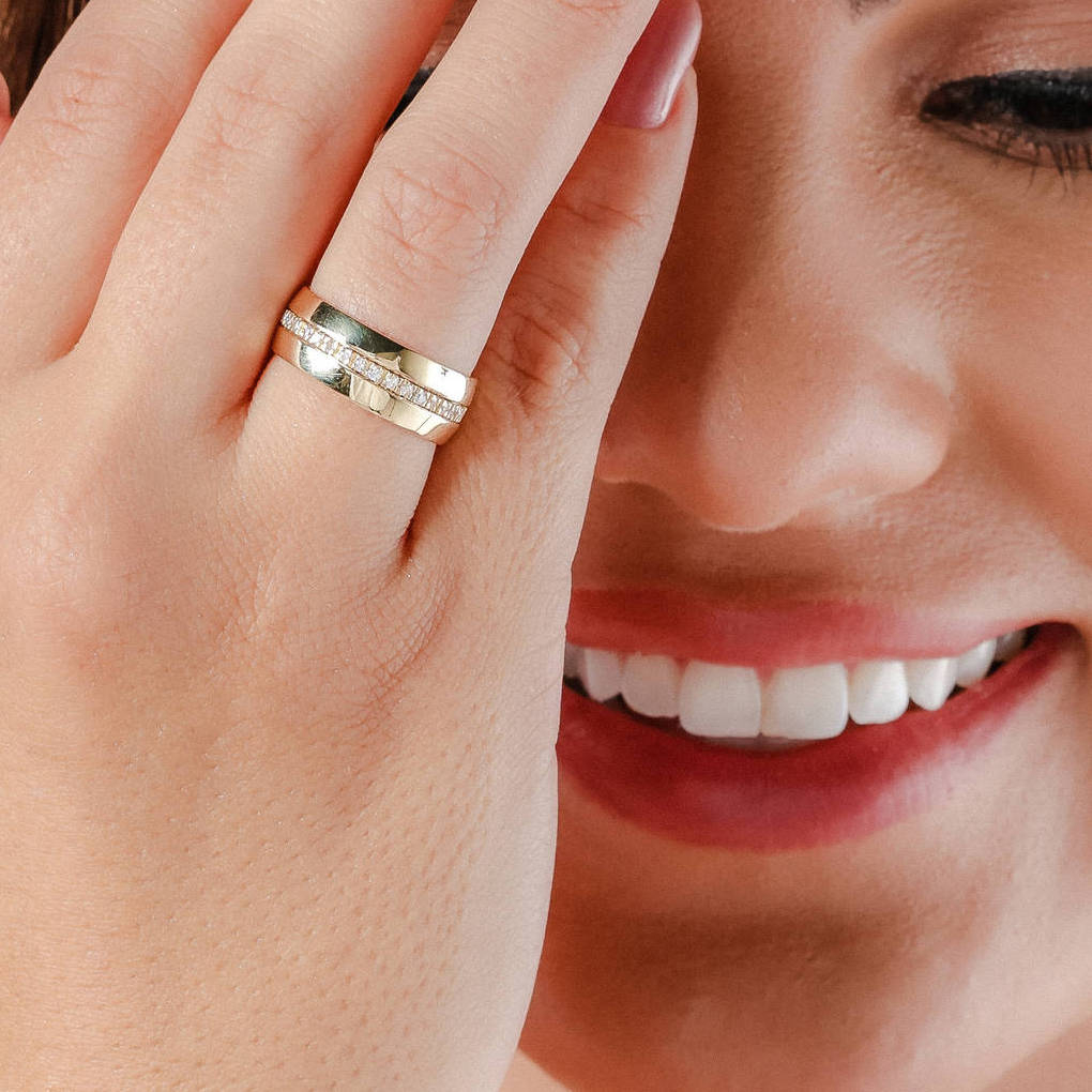 Aliança ouro amarelo abaulada anatômica com um filete no meio cravejado com diamantes de 1 ponto cada. 7 milímetros de largura.