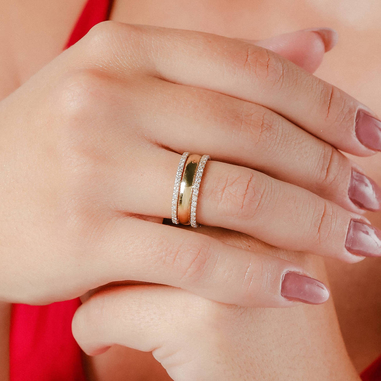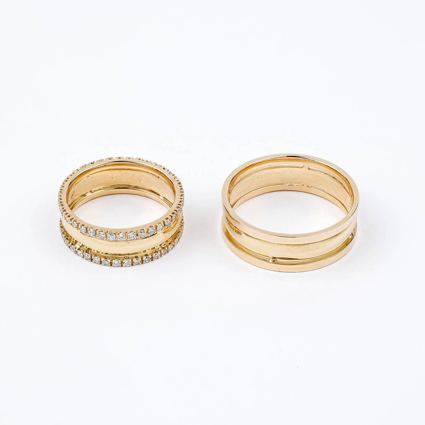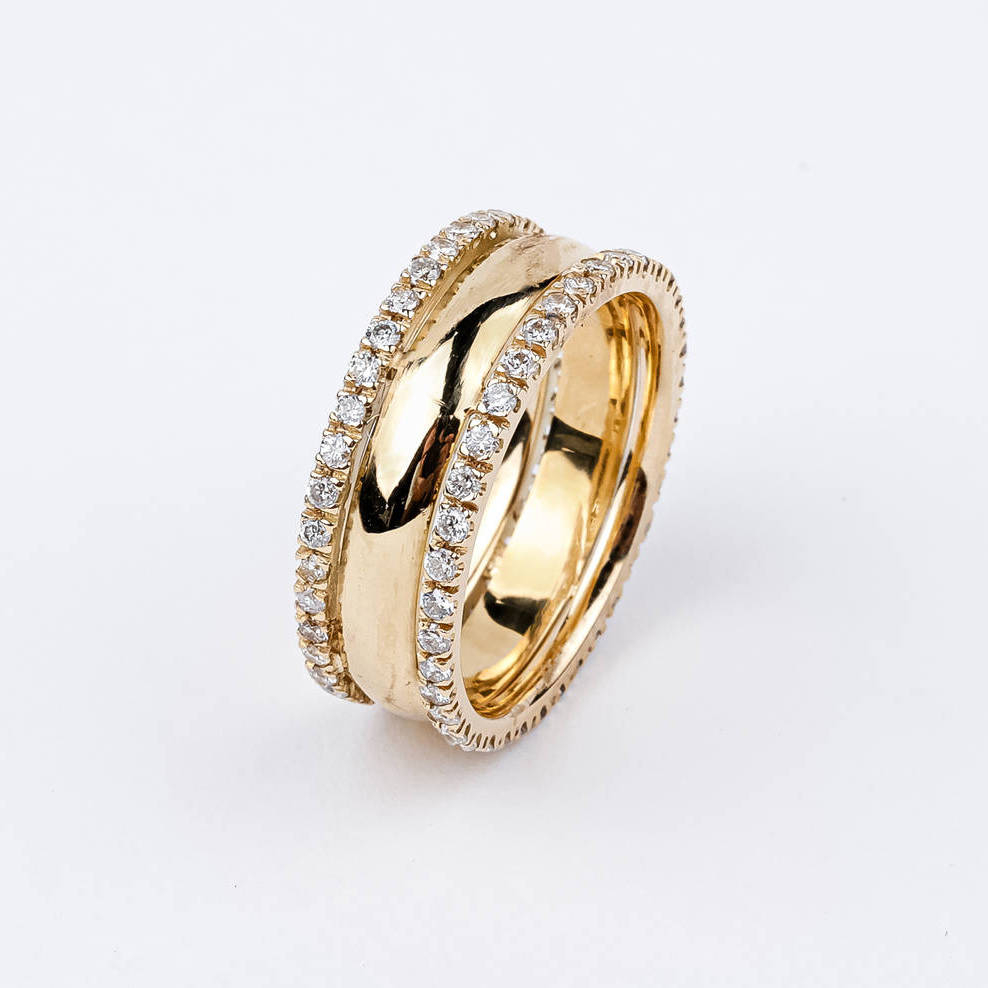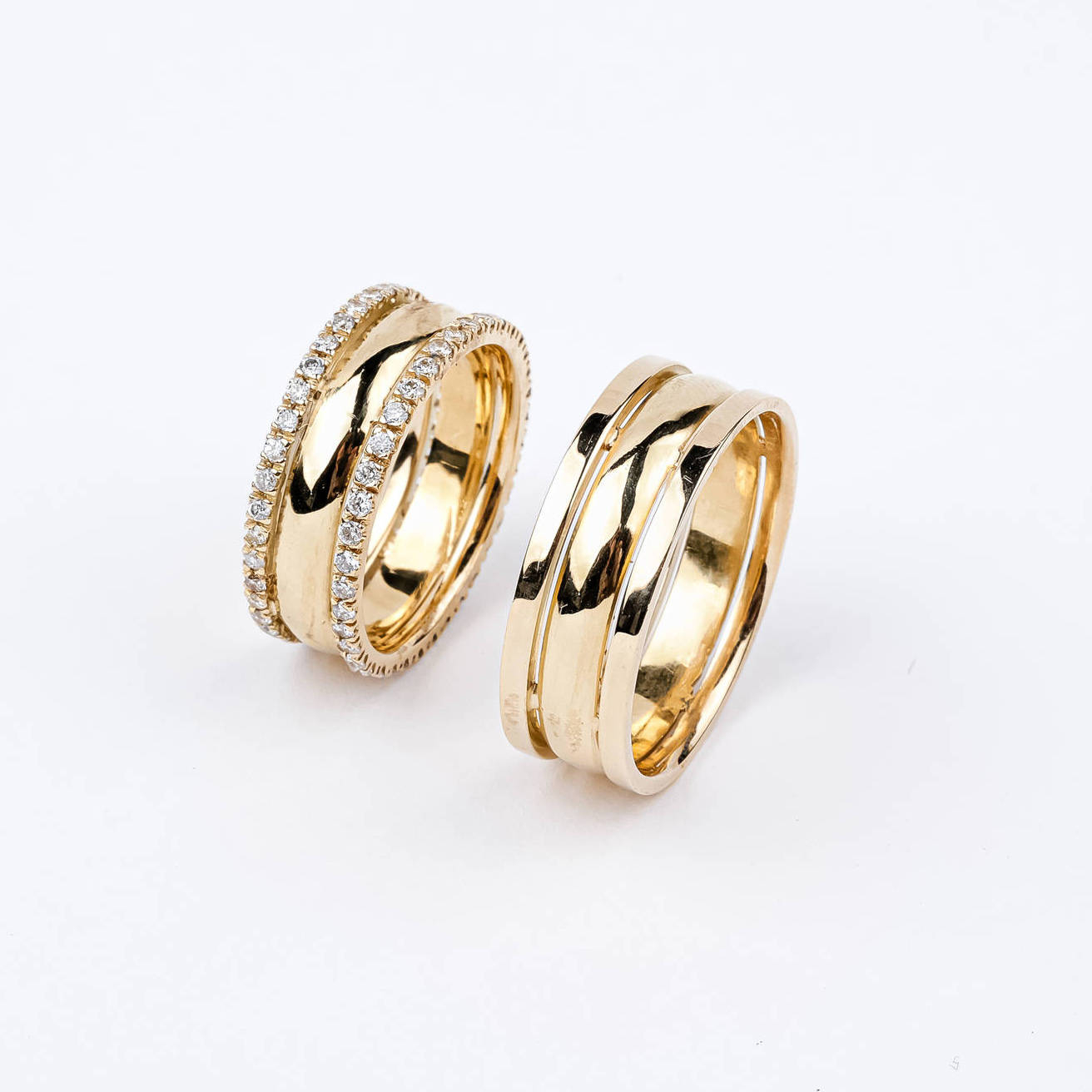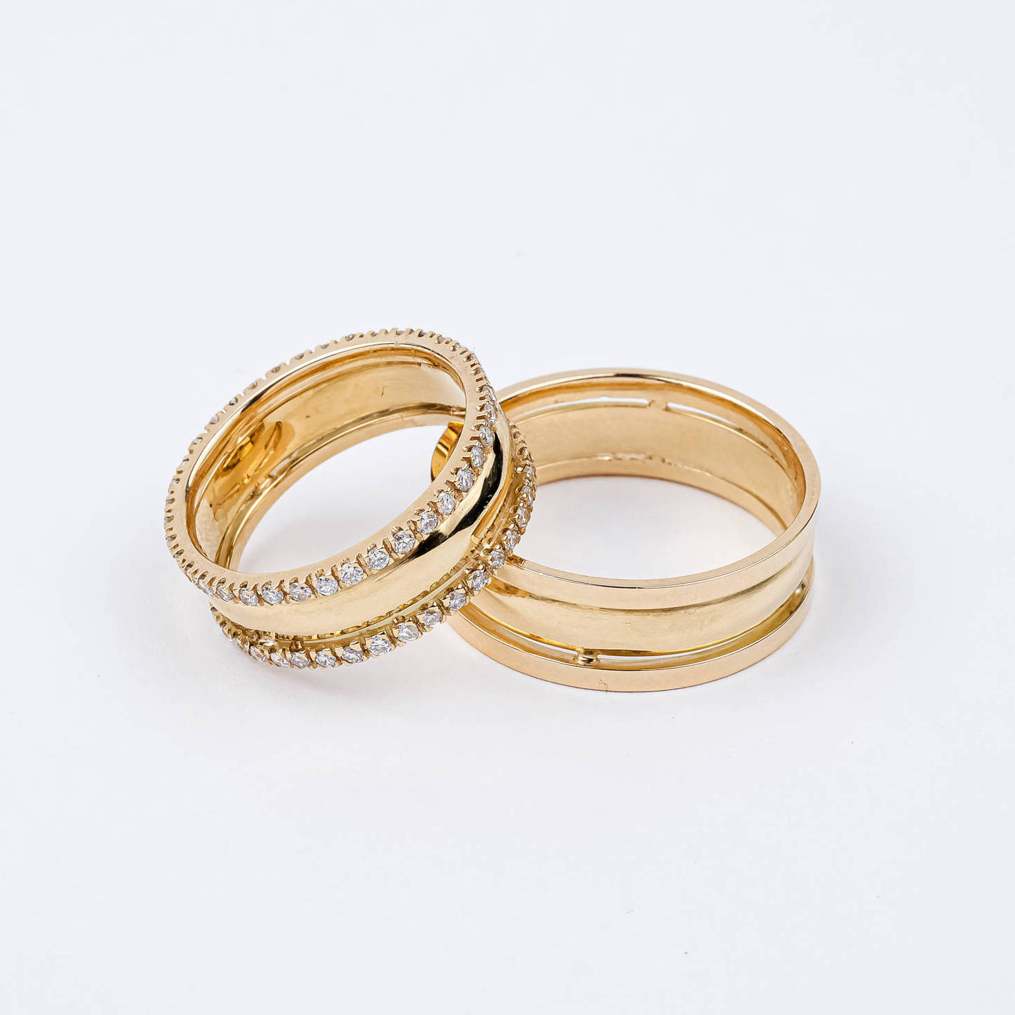 Aliança ouro amarelo abaulada por fora e reta por dentro com dois filetes na lateral cravejados com diamantes de 1 ponto cada. 7 milímetros de largura.