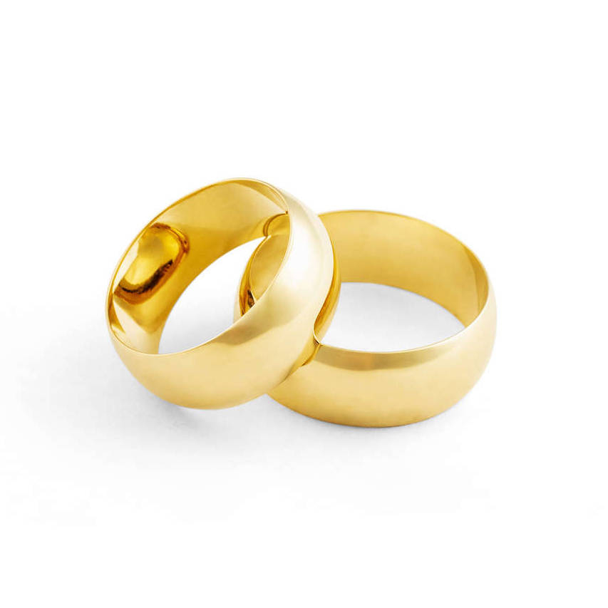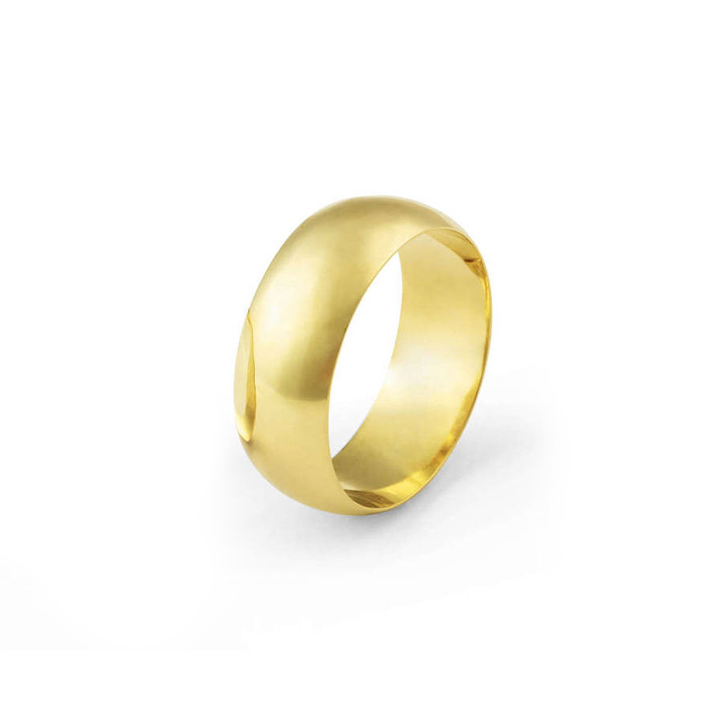 Aliança ouro amarelo tradicional anatômica, abaulada por fora e por dentro com largura de 8 milímetros
