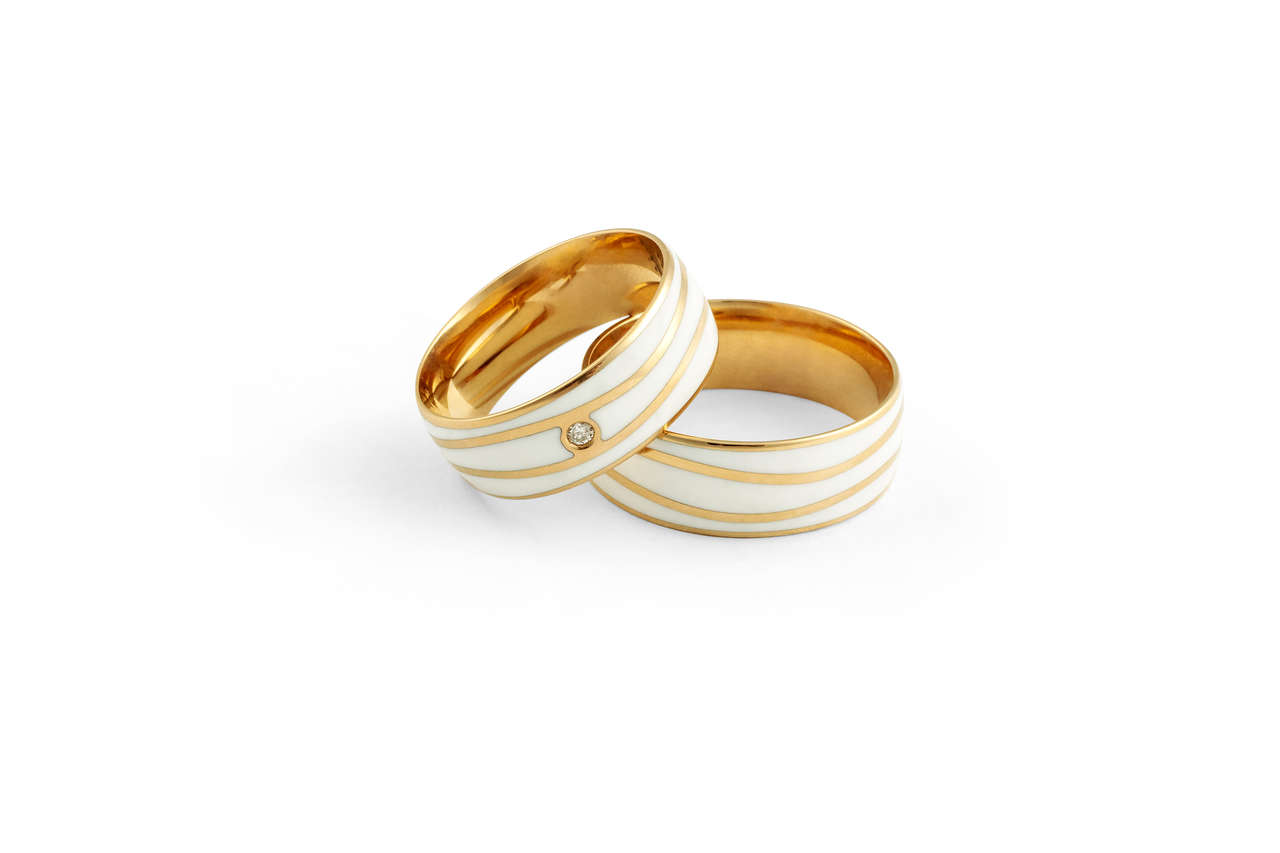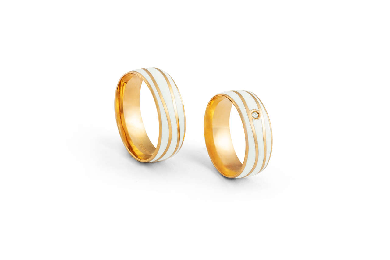 ALIANÇA OURO ROSÉ 18K COLEÇÃO SWAG COM 3 LISTRAS BRANCAS EM ONDAS ENTRE A ALIANÇA 5MM