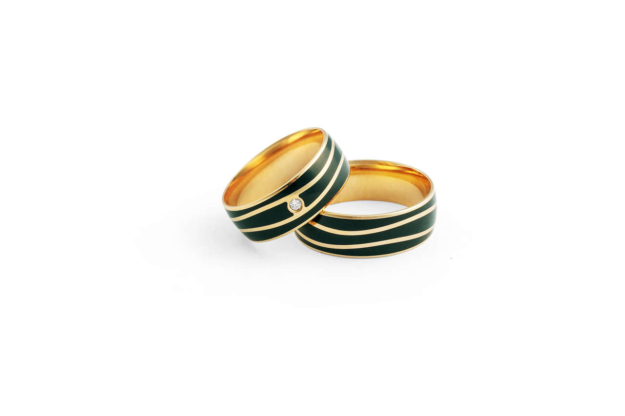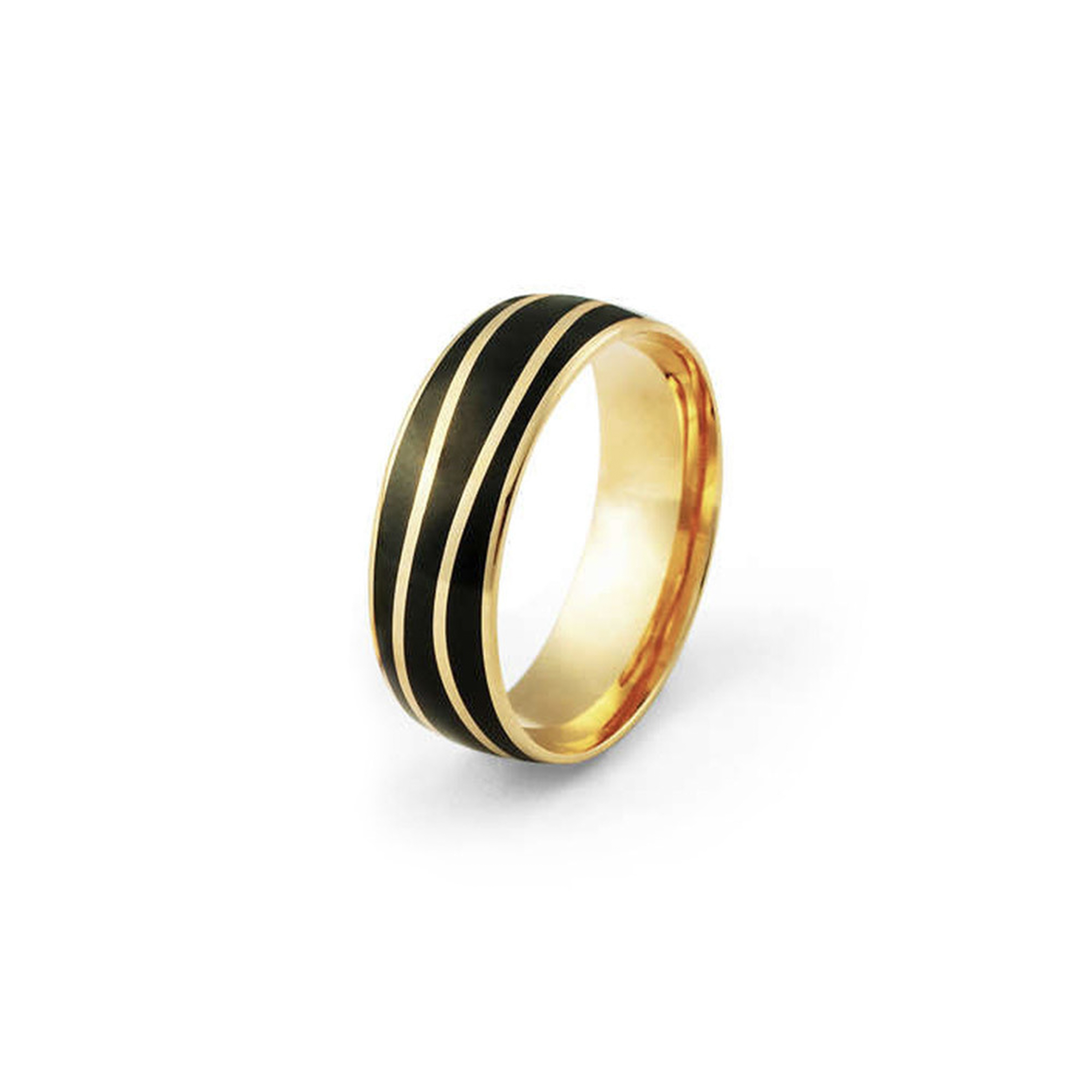 ALIANÇA OURO ROSÉ 18K COLEÇÃO SWAG COM 3 LISTRAS PRETAS EM ONDAS ENTRE A ALIANÇA 5MM