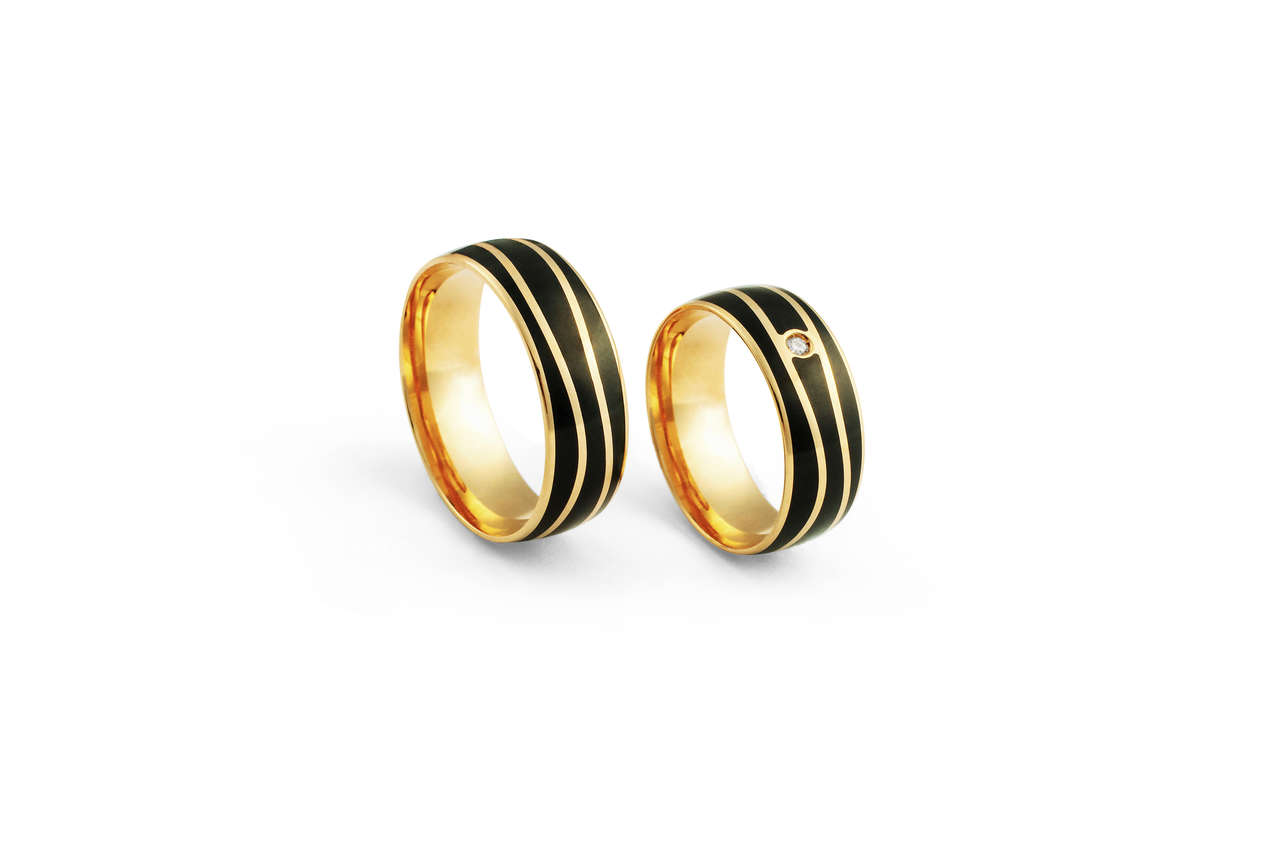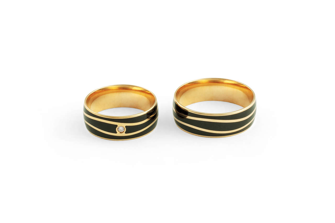 ALIANÇA OURO ROSÉ 18K COLEÇÃO SWAG COM 3 LISTRAS PRETA EM FORMATO ONDAS COM UM BRILHANTE NO MEIO DA ALIANÇA 7MM