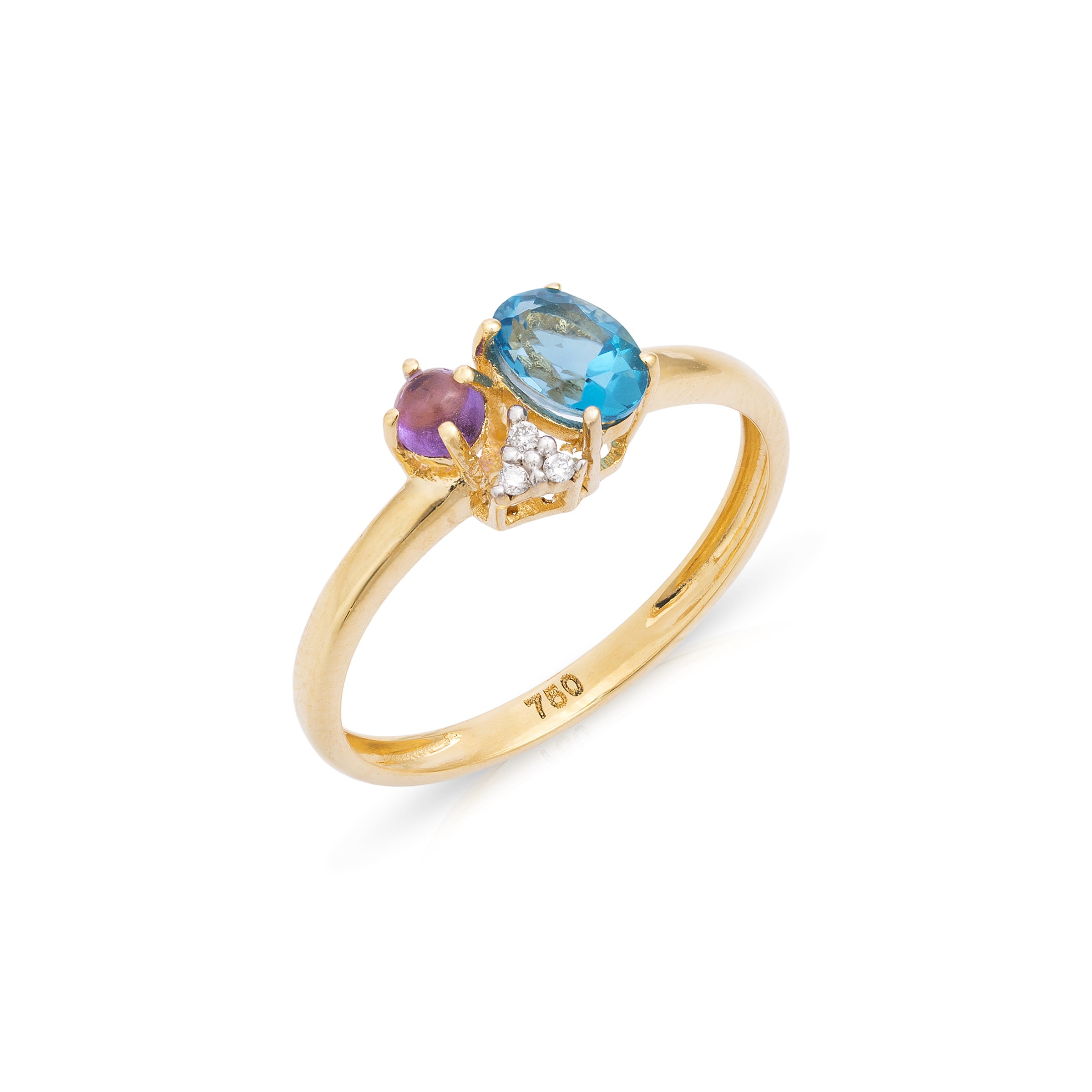 Anel ouro amarelo 18K com diamantes, topázio London Blue e ametista.