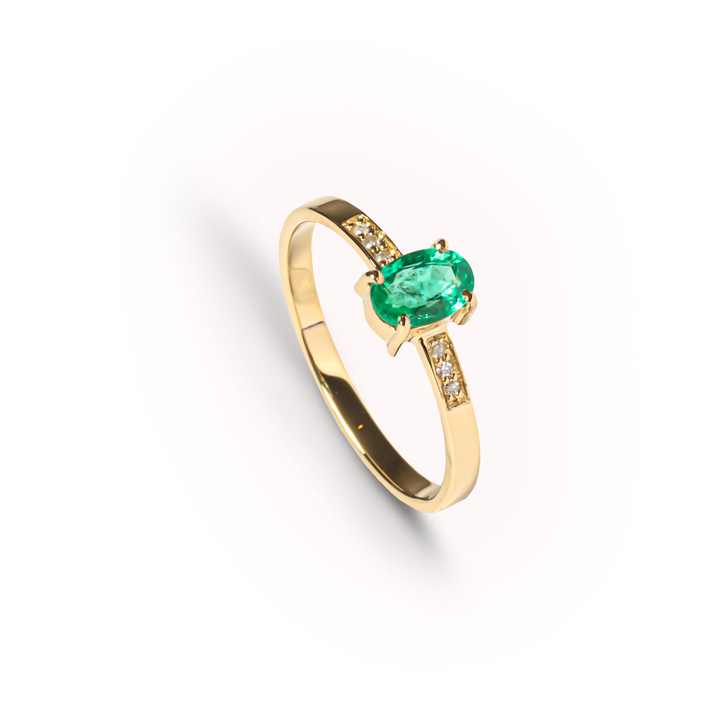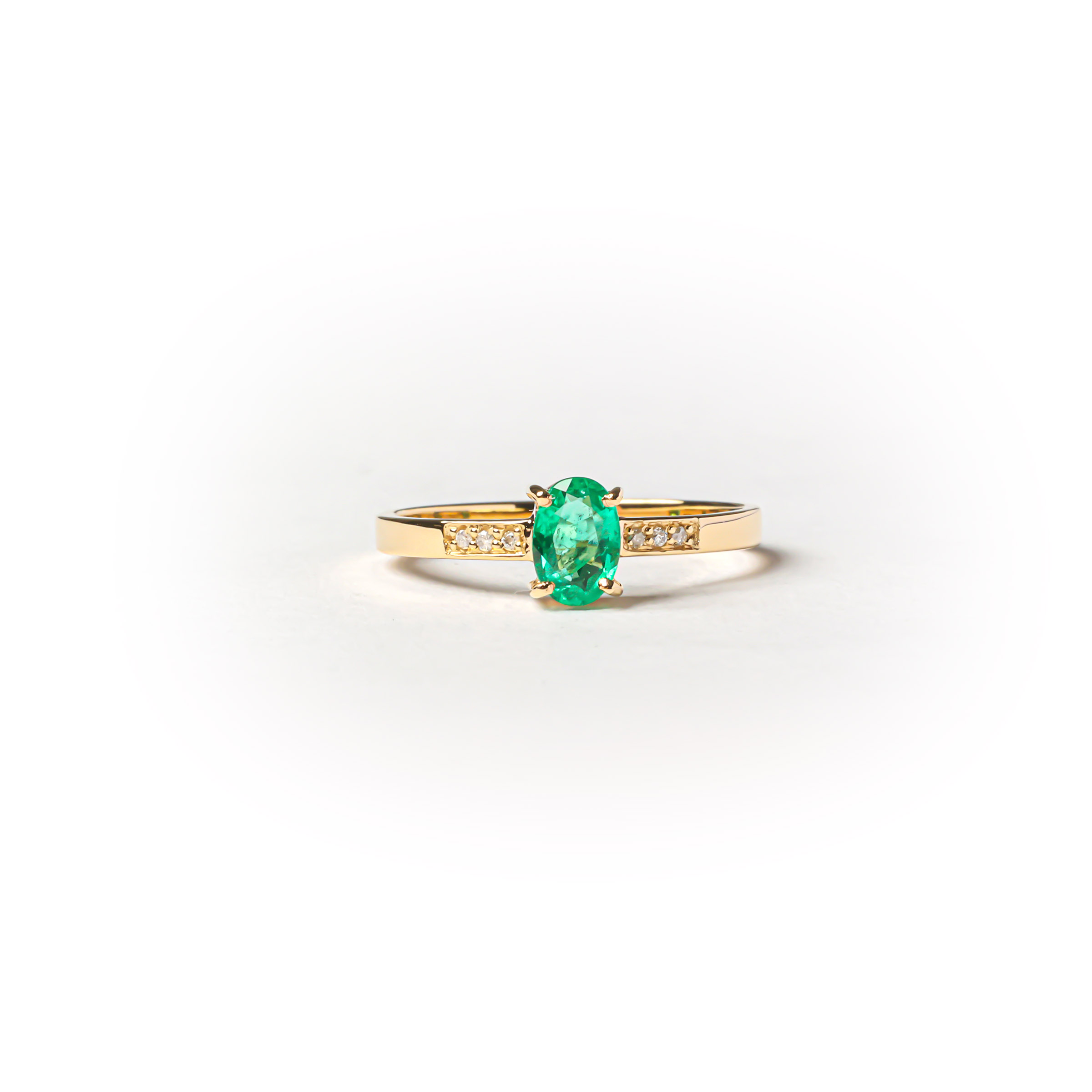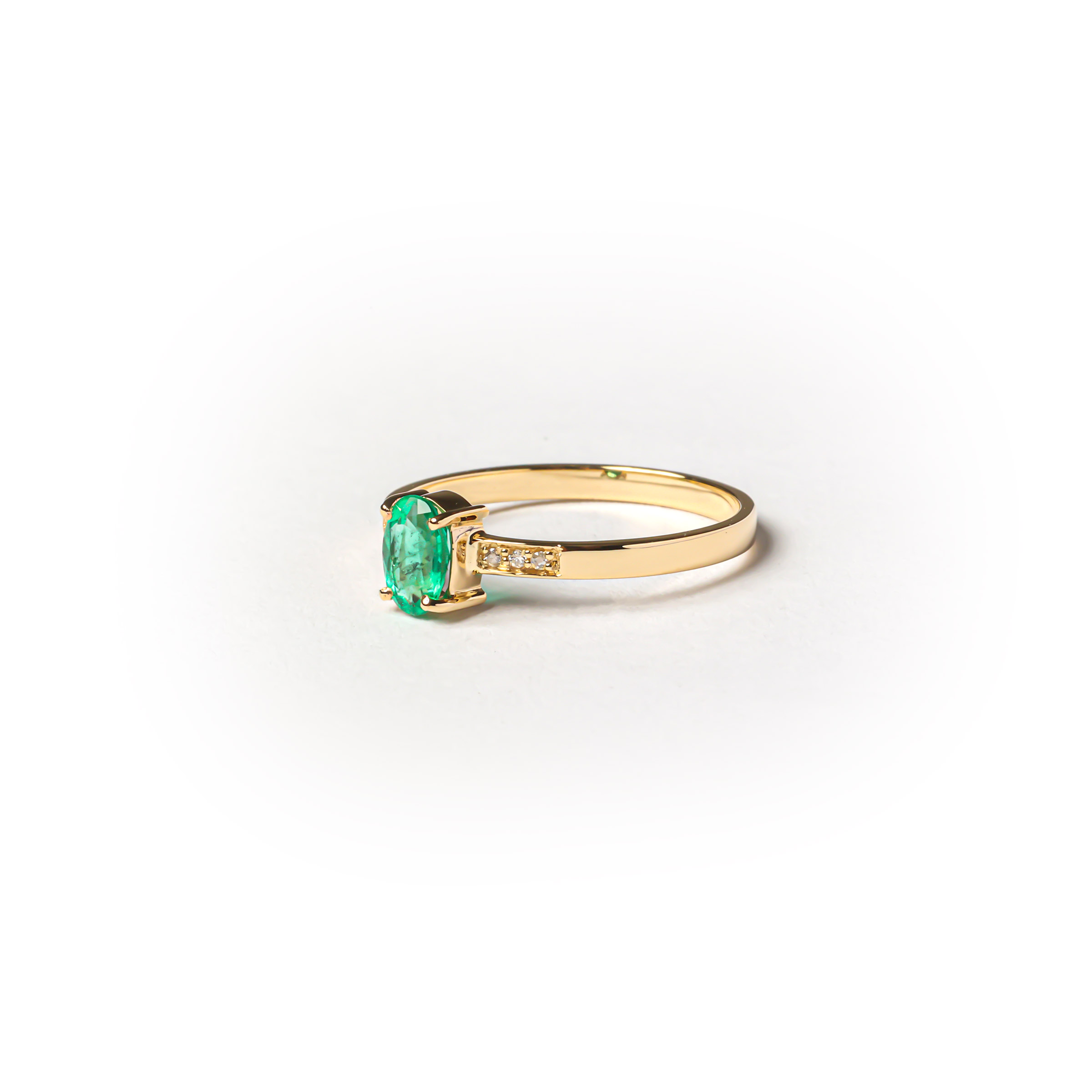 Anel de ouro amarelo 18K com 1 esmeralda e 6 diamantes.