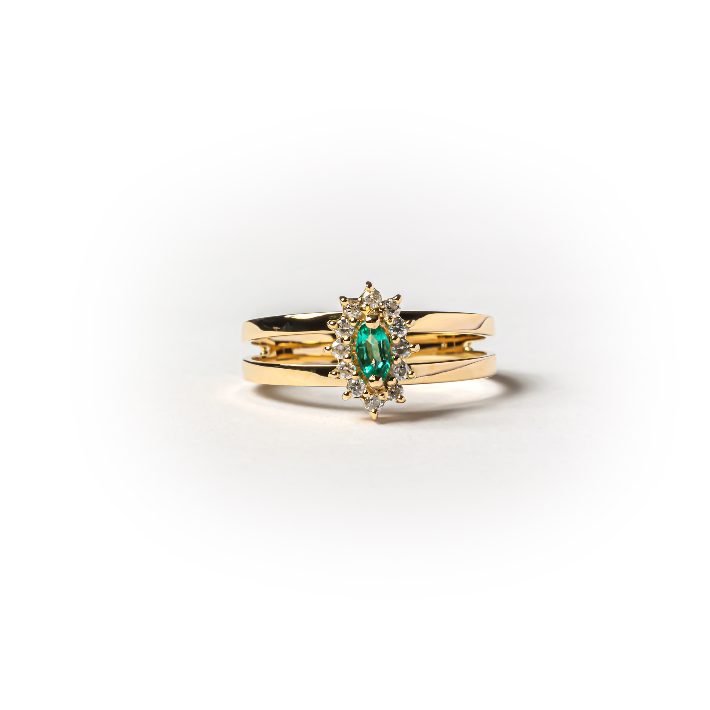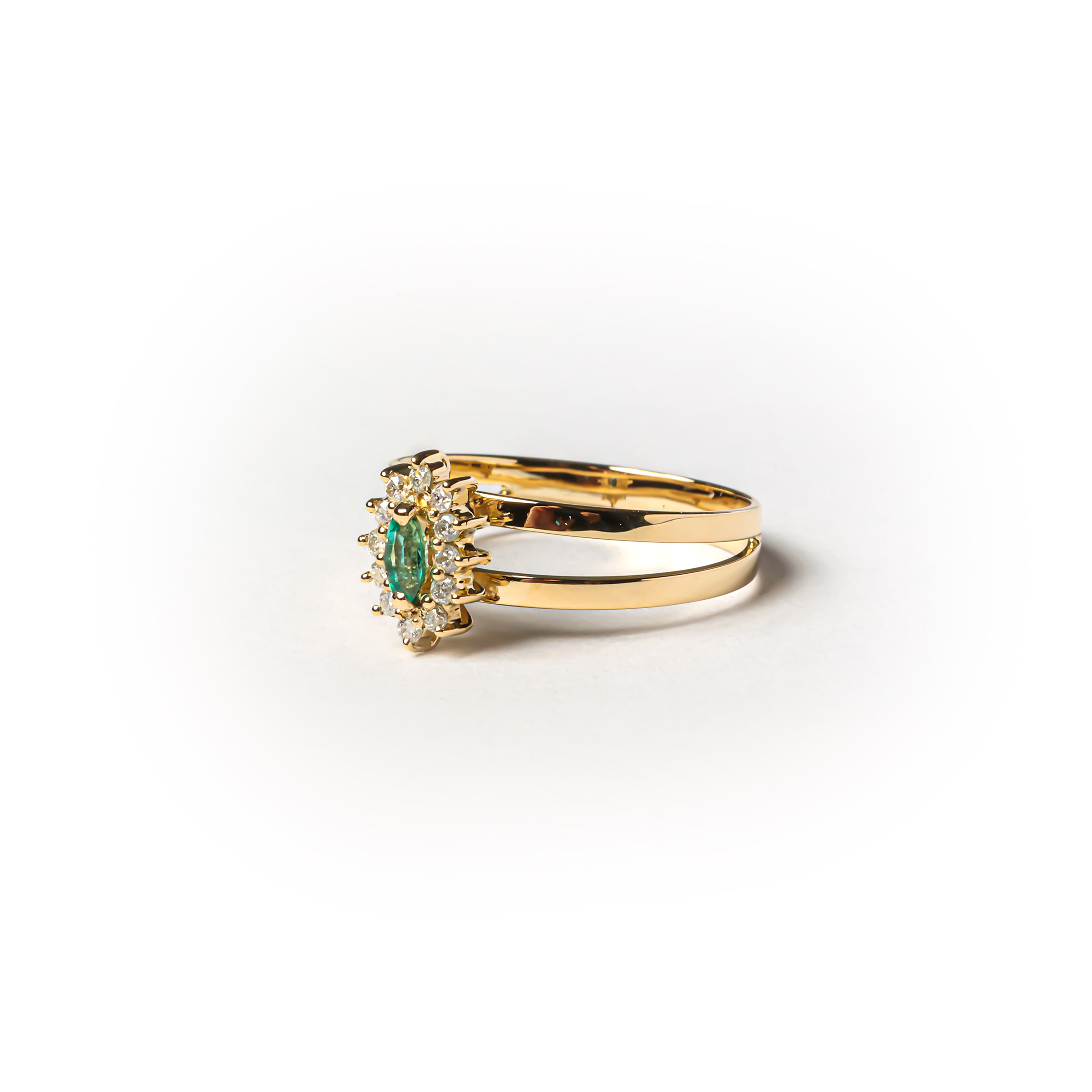 Anel de ouro amarelo 18K com 1 esmeralda e 12 diamantes.