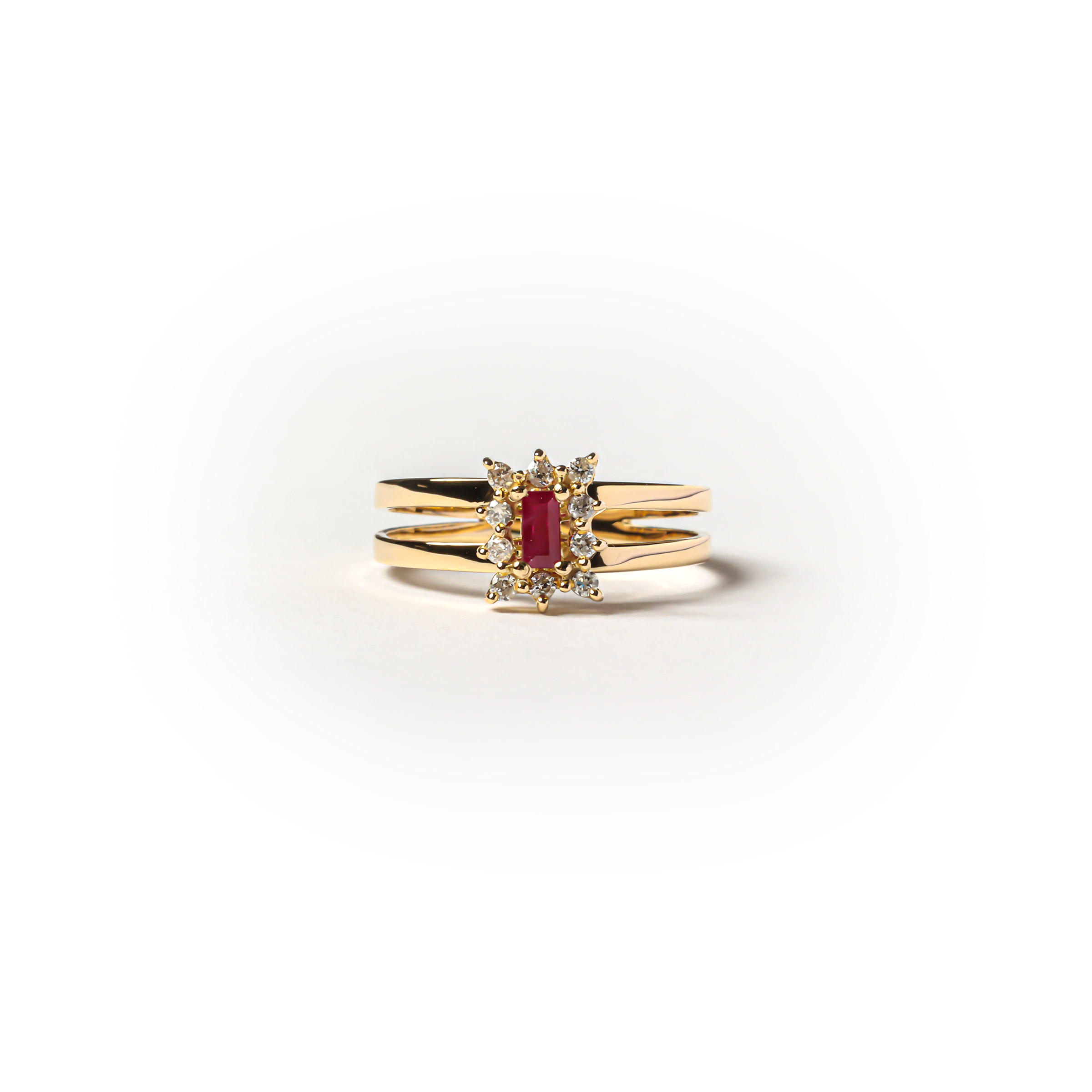 Anel de ouro amarelo 18K com 1 rubi e 10 diamantes.