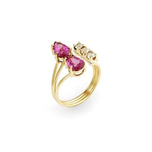 Anel de ouro amarelo 18K com 1 rubi e 14 diamantes.