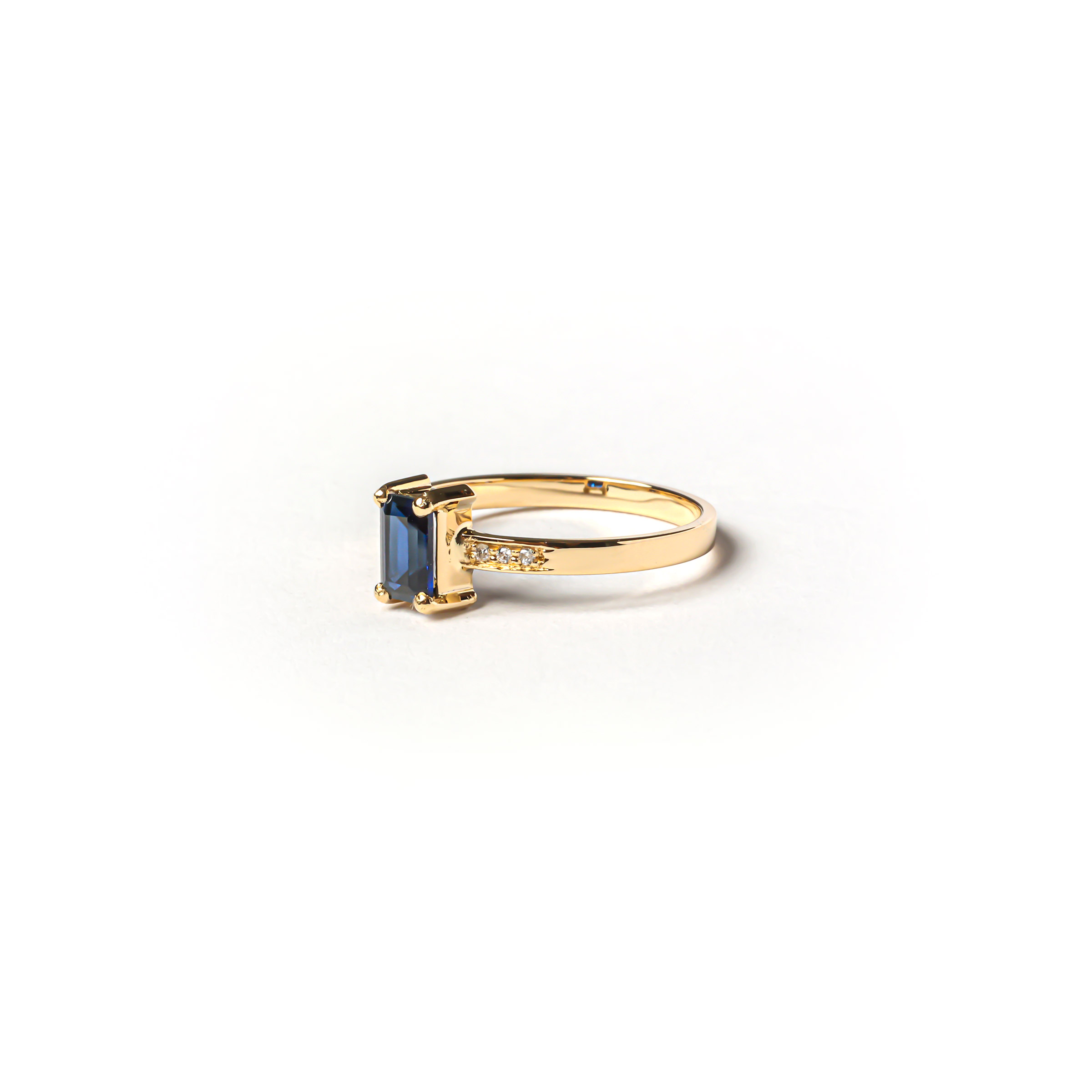 Anel de ouro amarelo 18K com 1 safira e 6 diamantes.