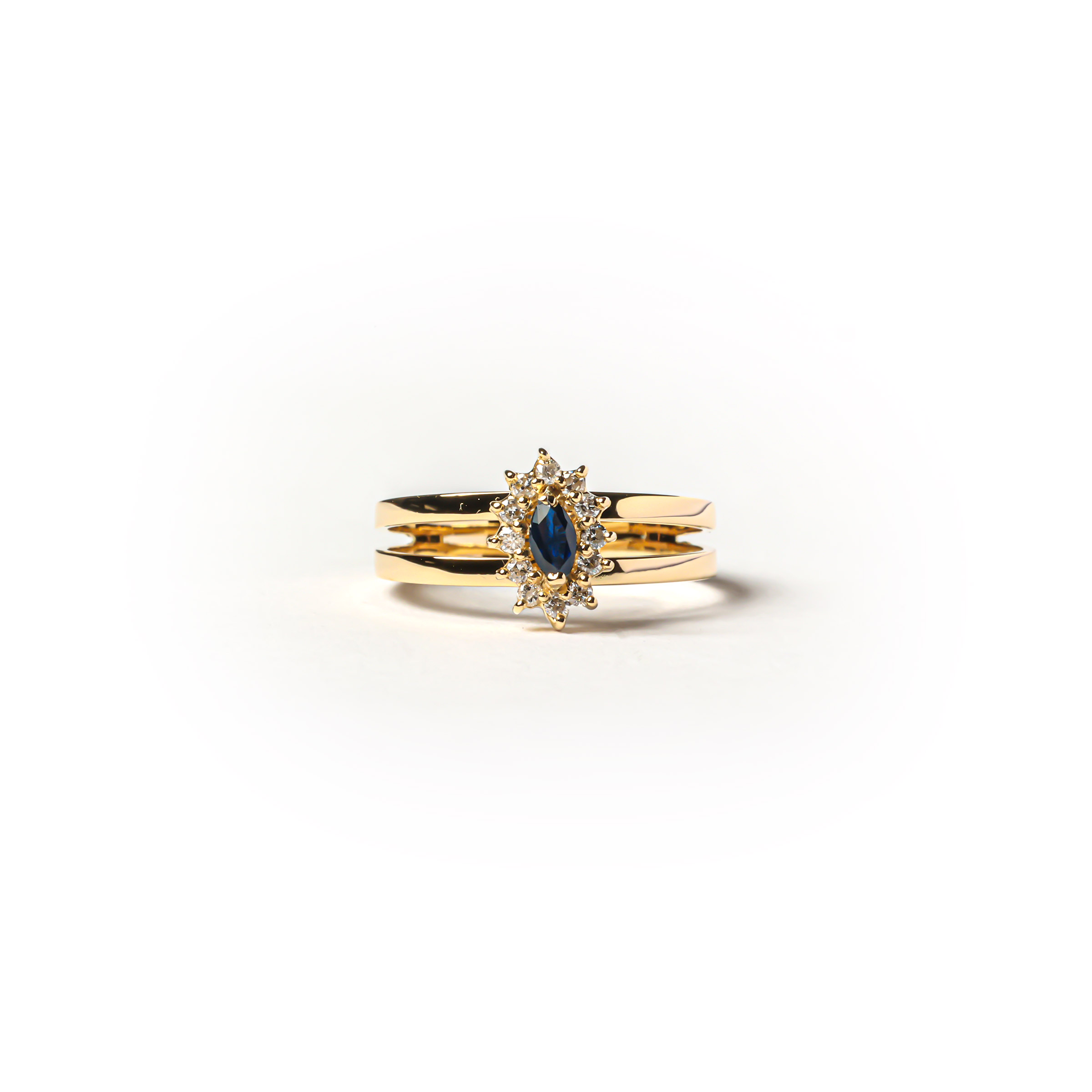 Anel de ouro amarelo 18K com 1 safira e 12 diamantes.