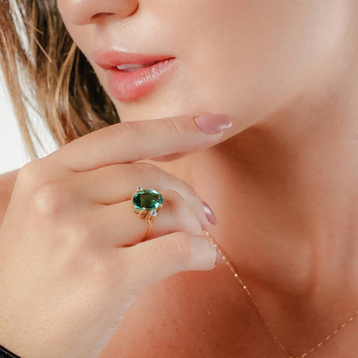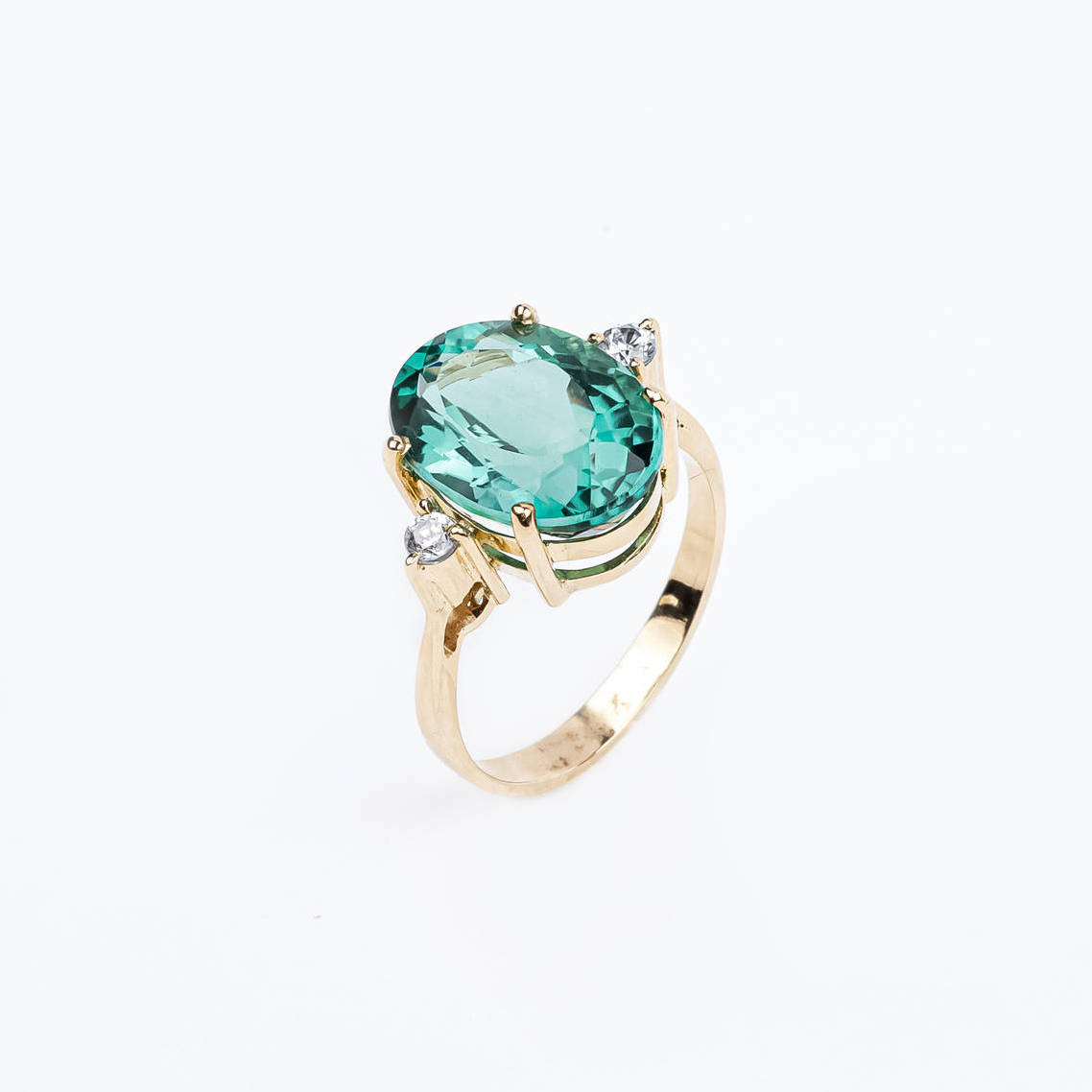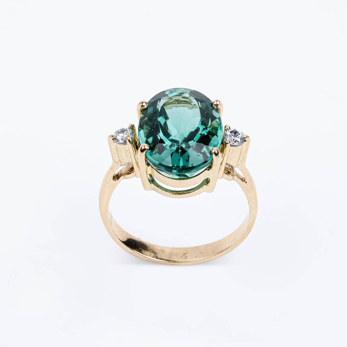 Anel ouro amarelo com um topázio verde no centro e uma safira branca em cada lateral. Anel no aro tamanho 17.