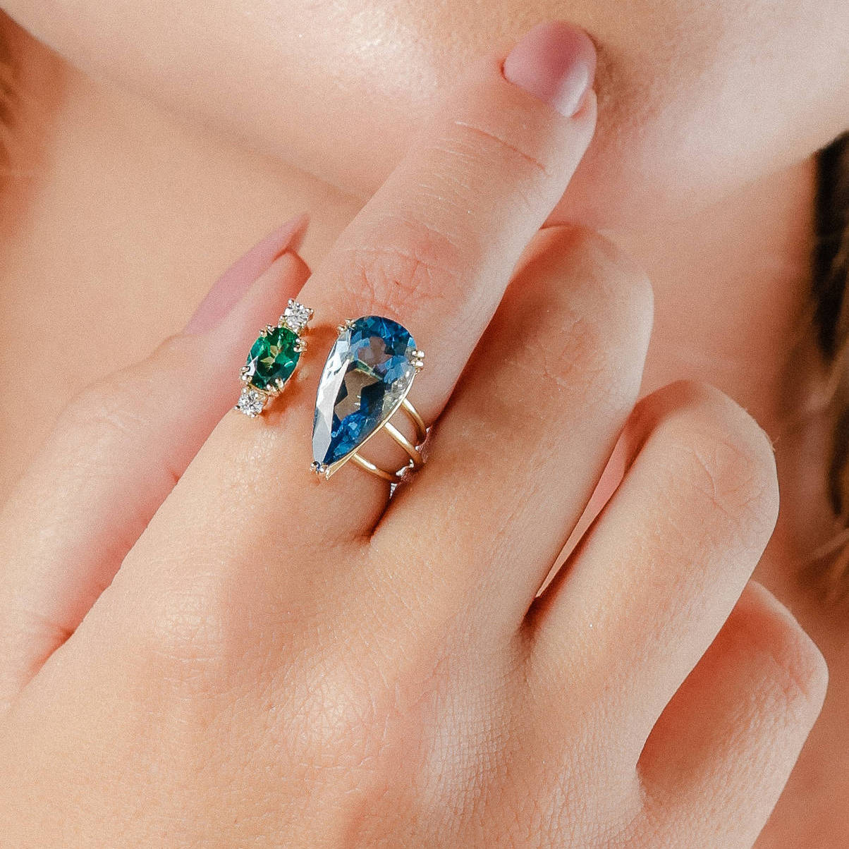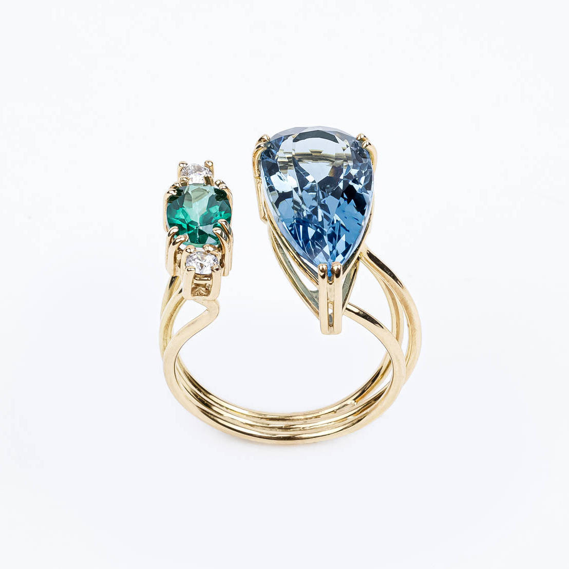 Anel ouro amarelo com um topázio azul lapidação gota, um topázio verde oval e duas safiras brancas. Anel com aro no tamanho 17.