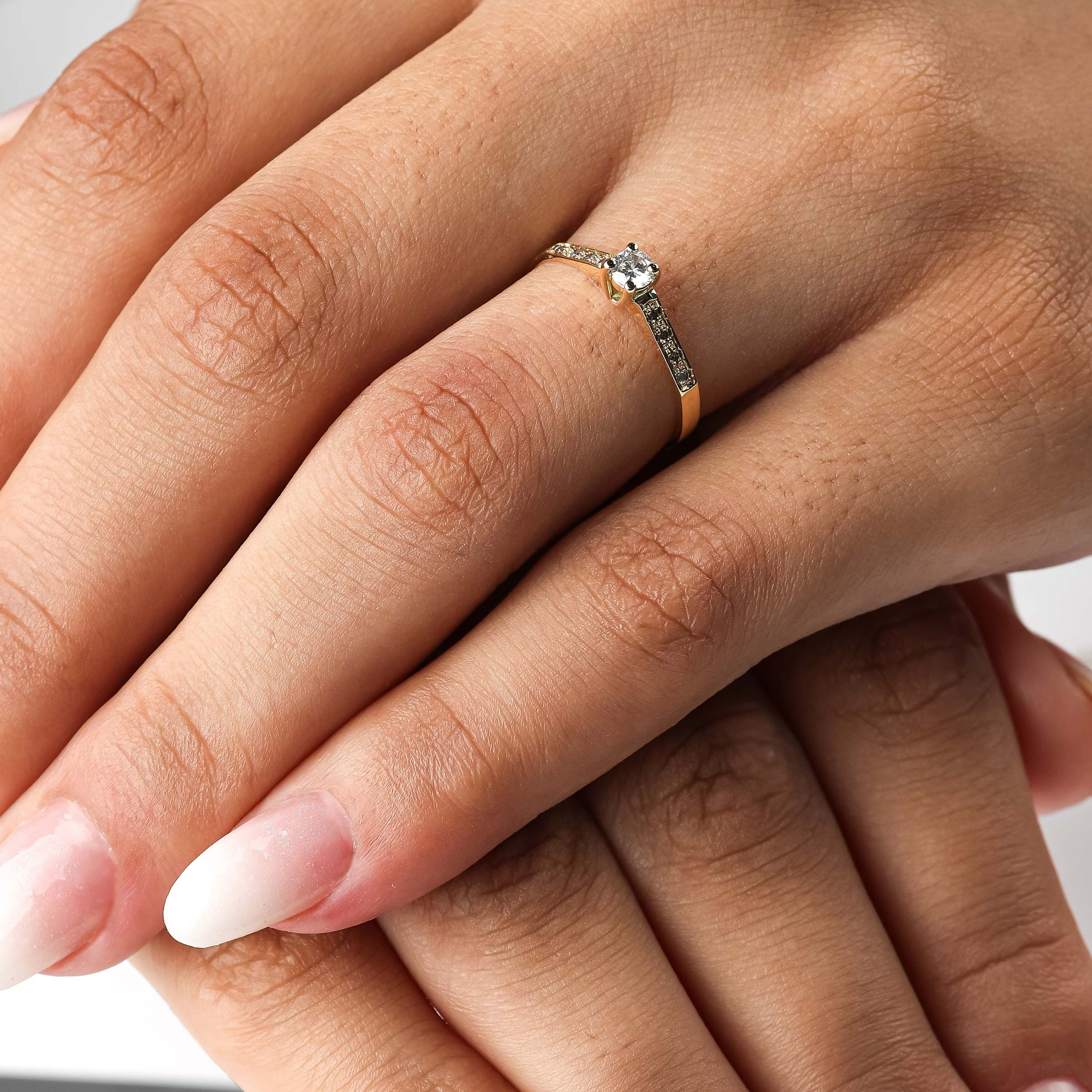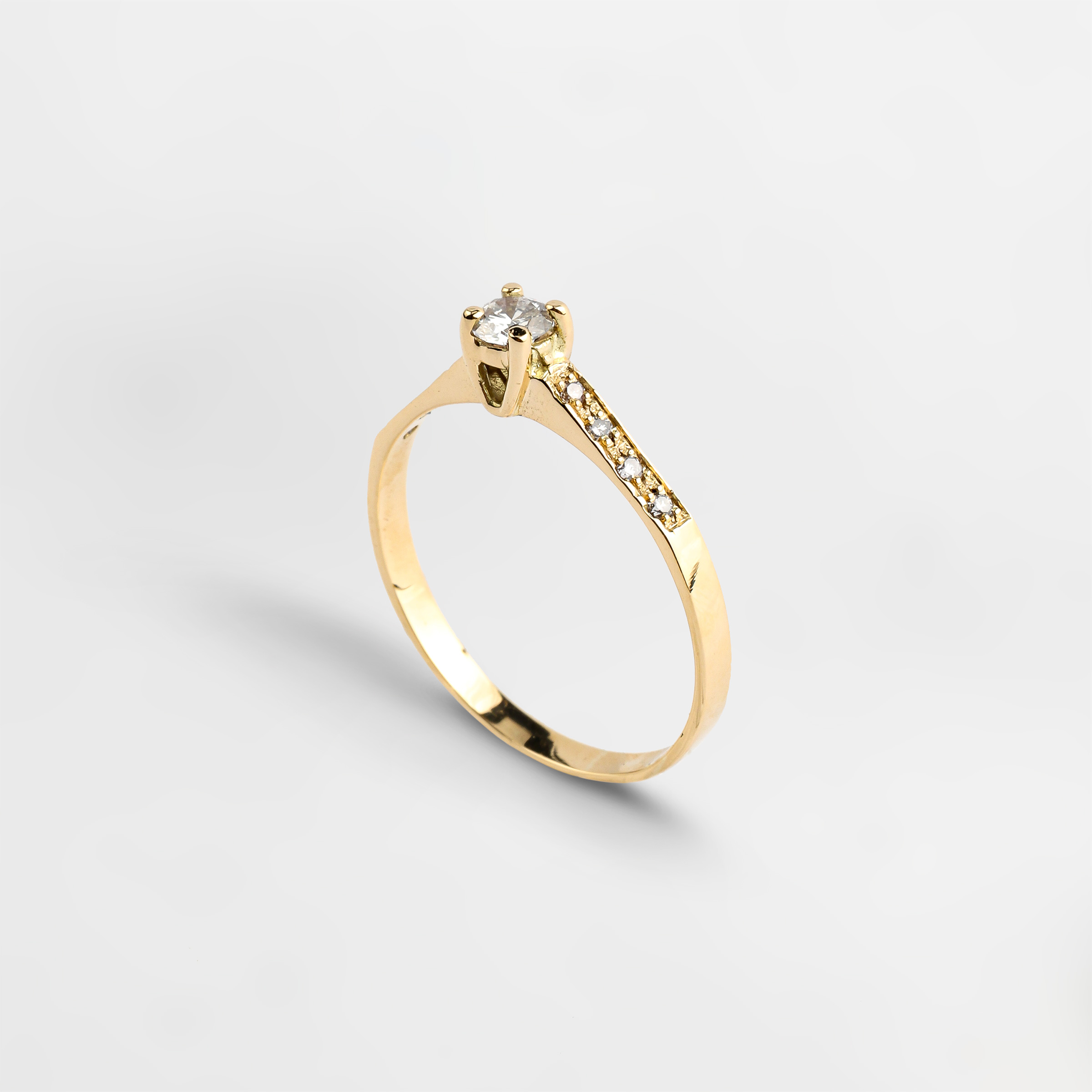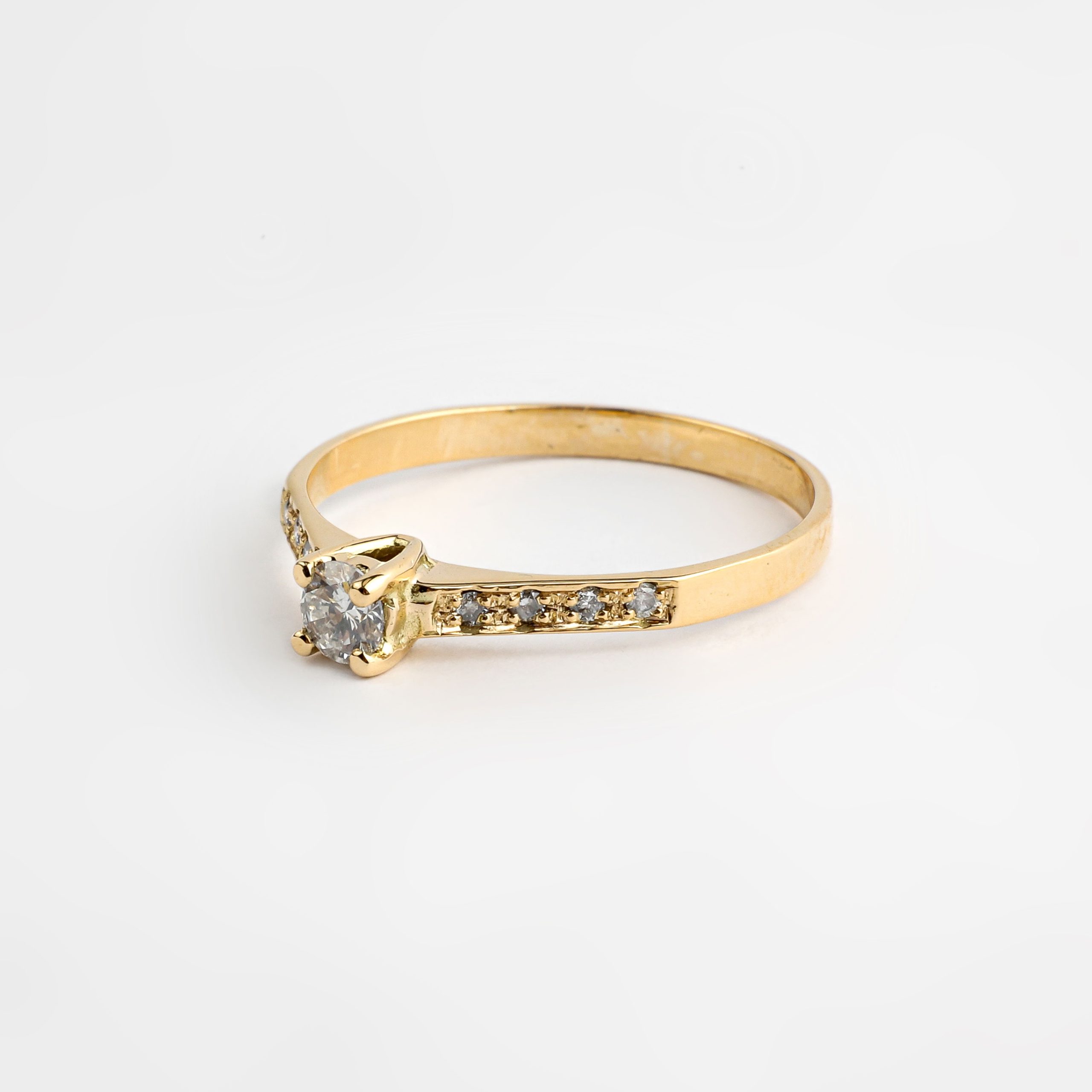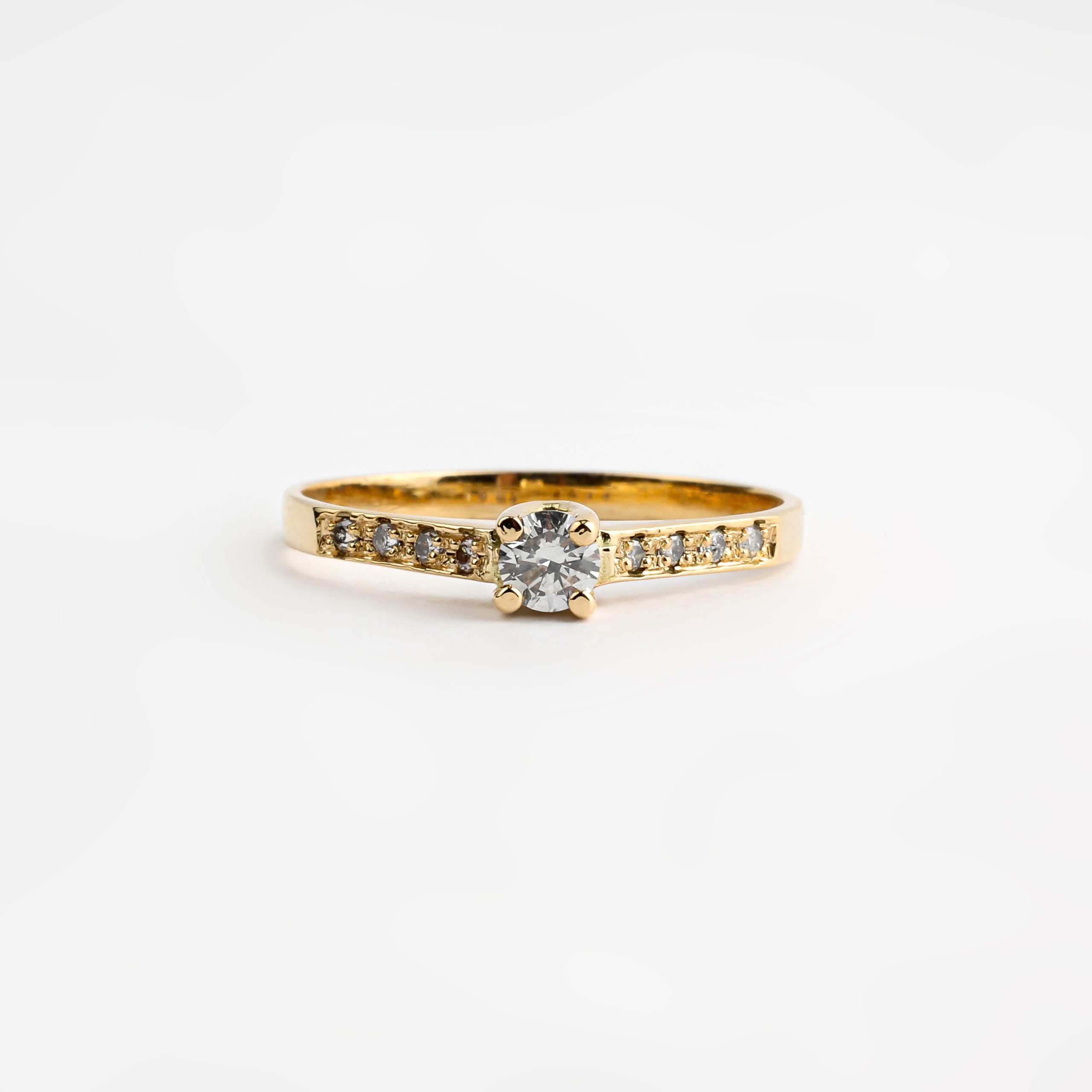 Anel solitário ouro amarelo 18K com 27 pontos de diamantes.