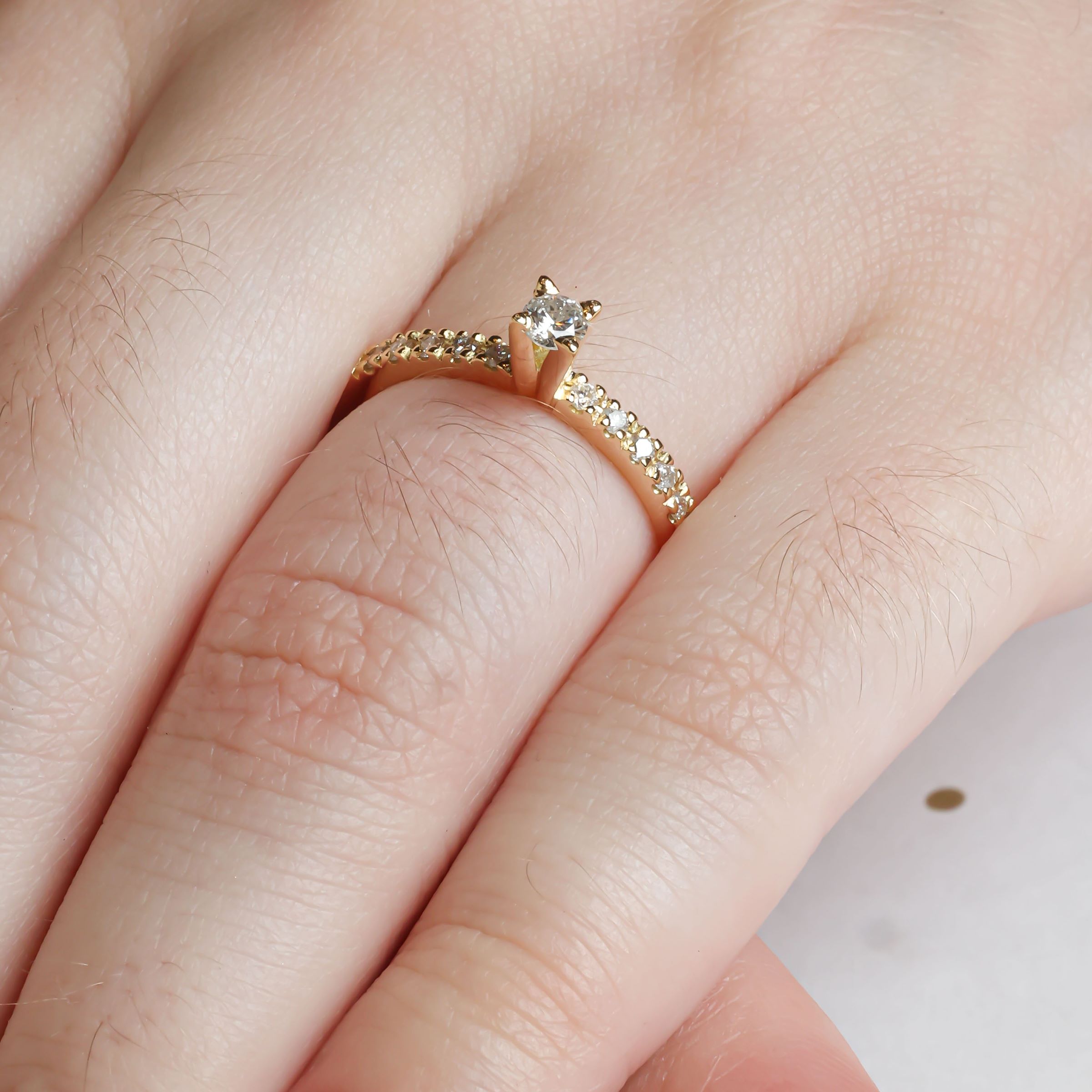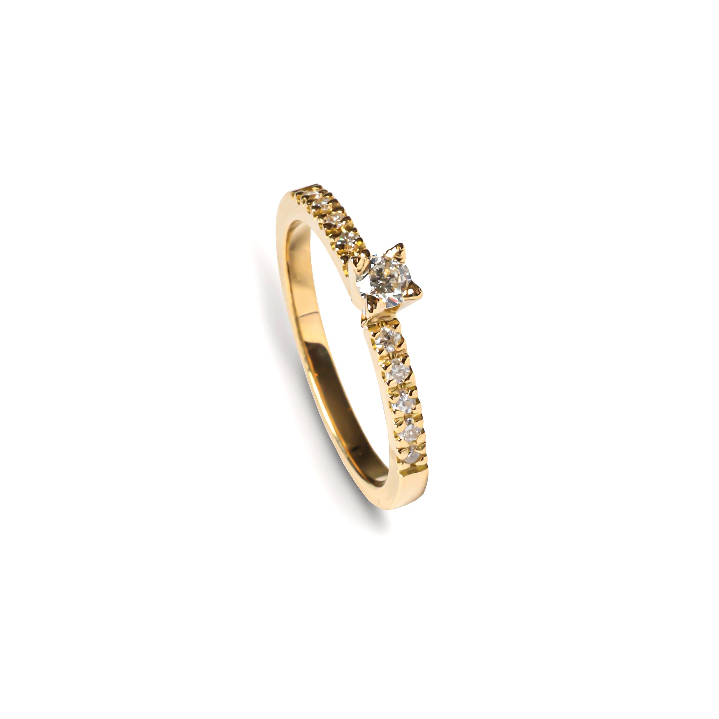 Anel solitário ouro amarelo 18K com 30 pontos de diamantes.