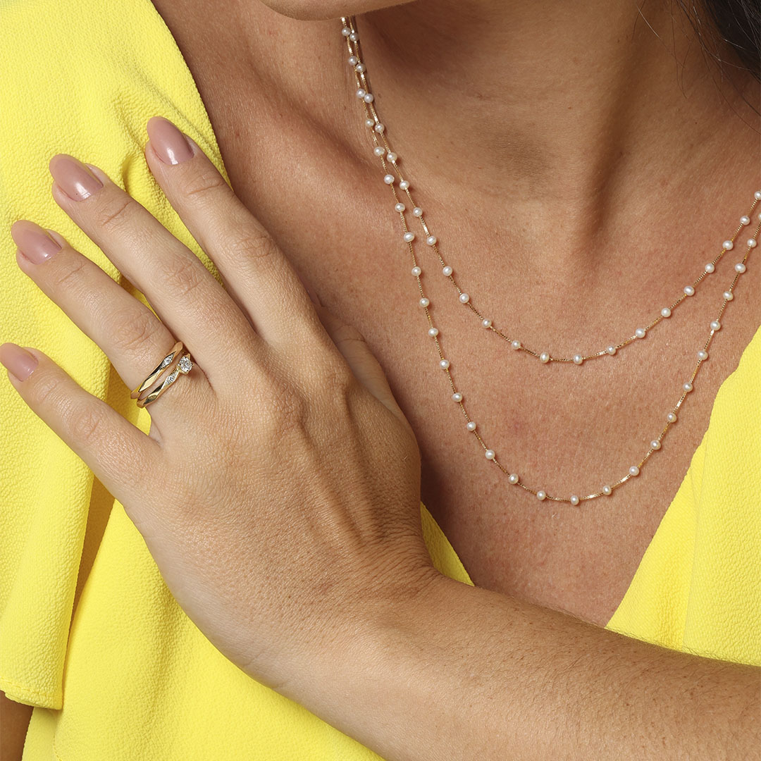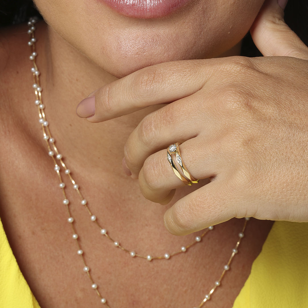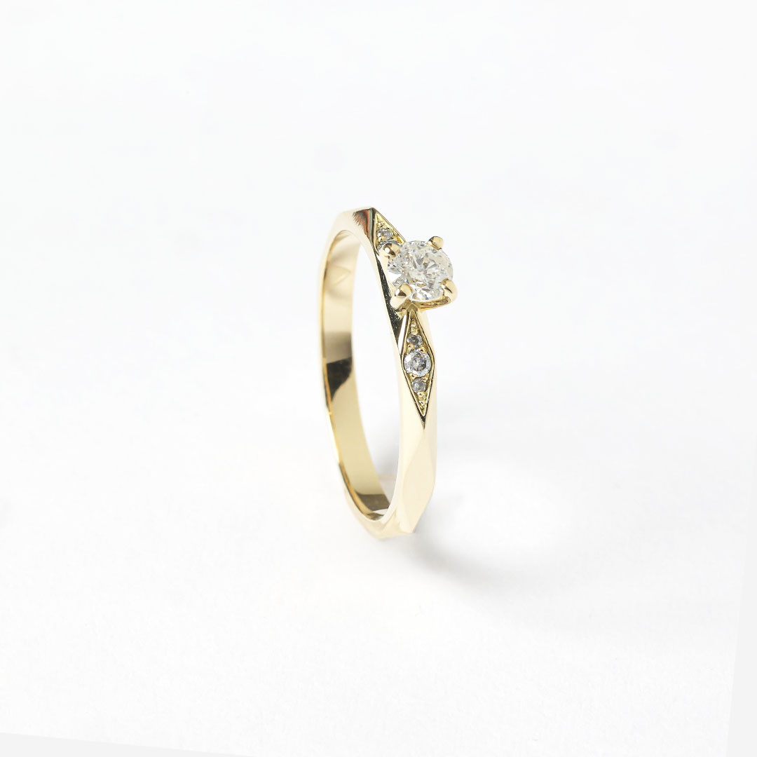 Anel Solitário ouro amarelo 18K com 31 pontos de diamantes.