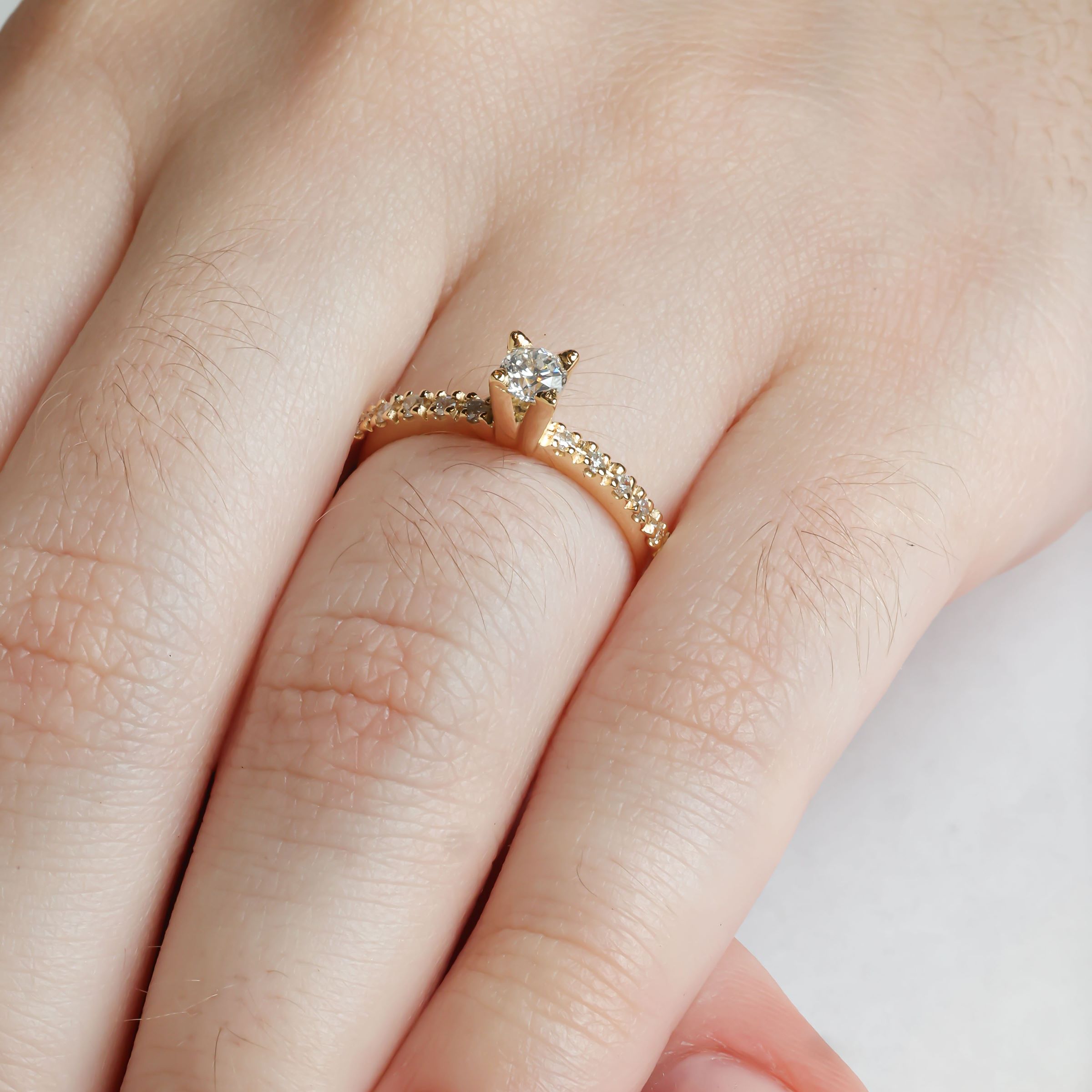 Anel solitário ouro amarelo 18K com 35 pontos de diamantes.