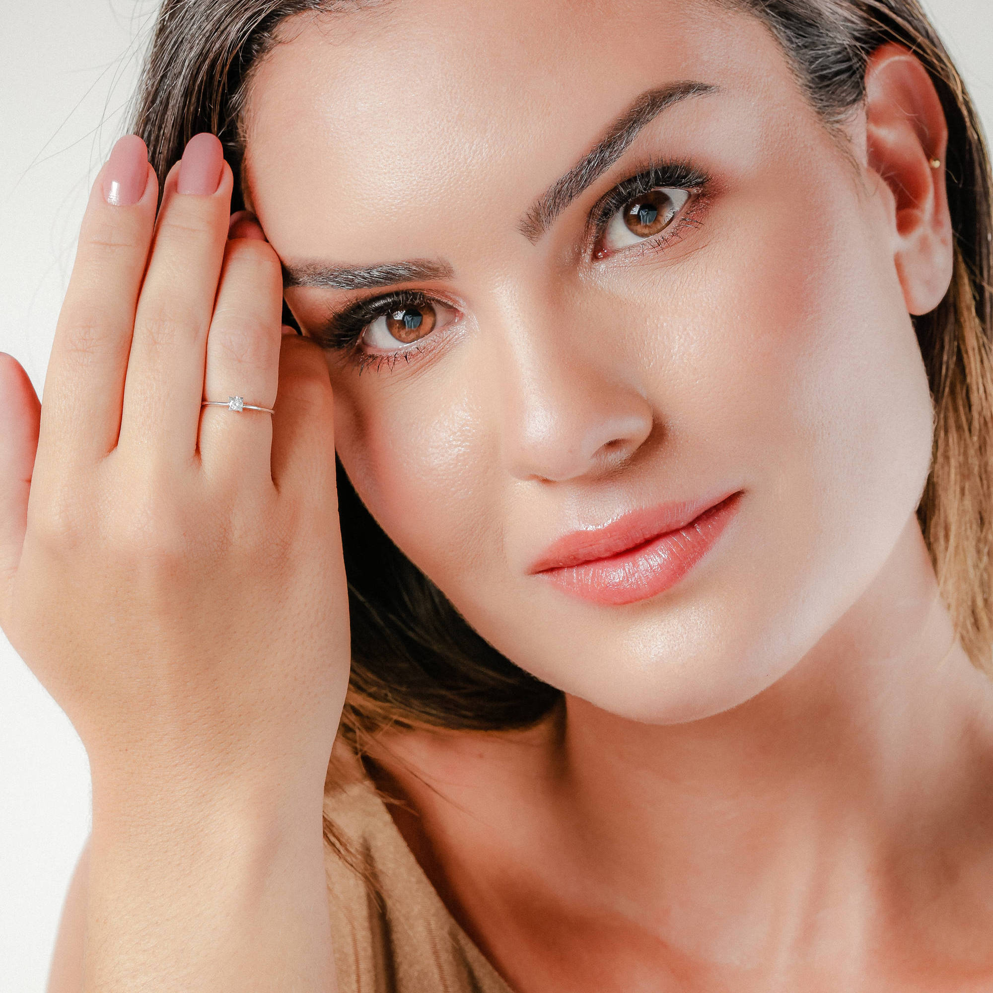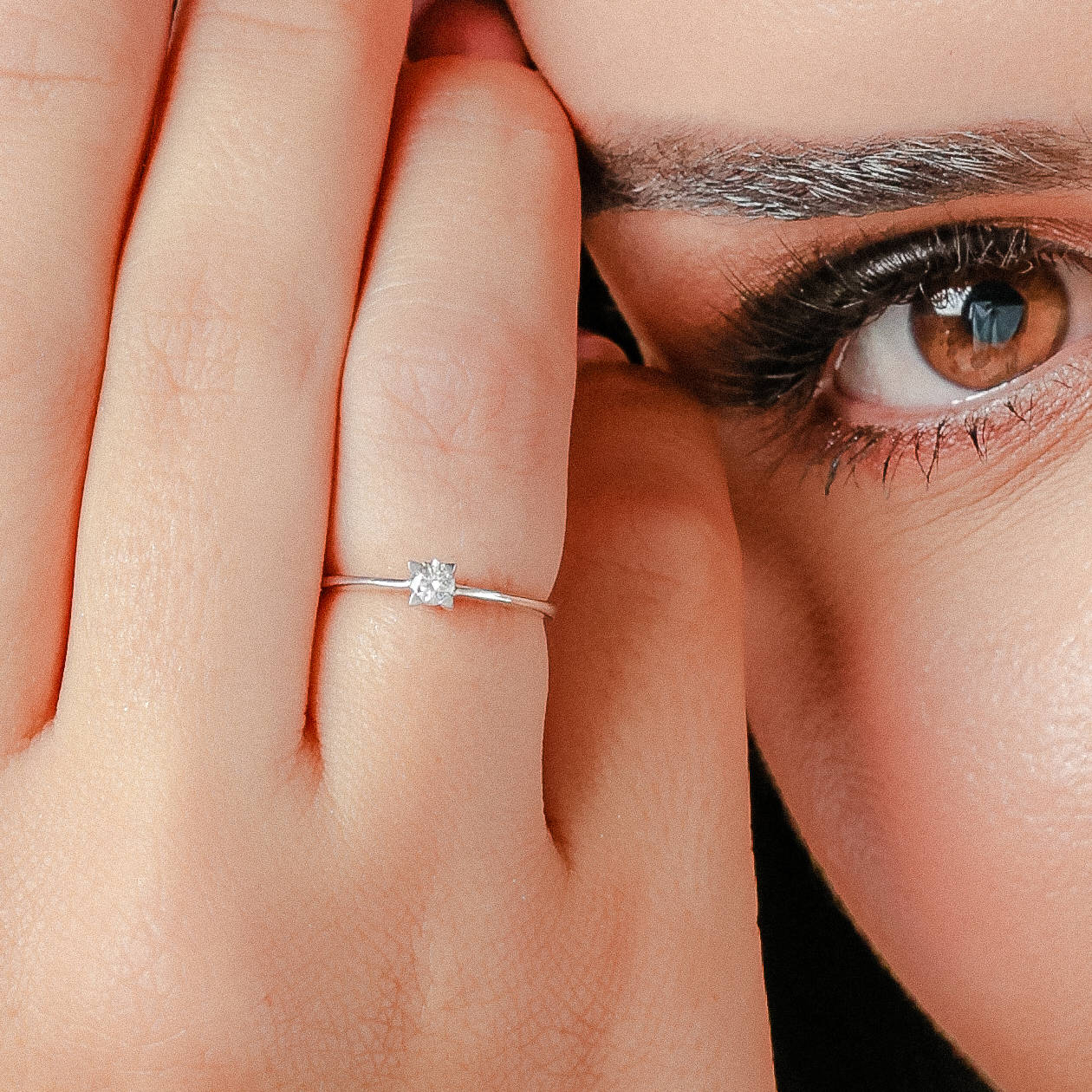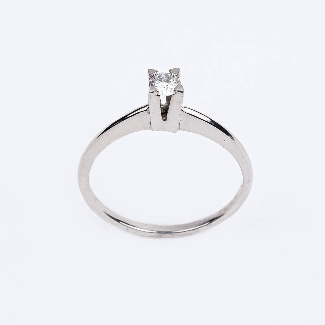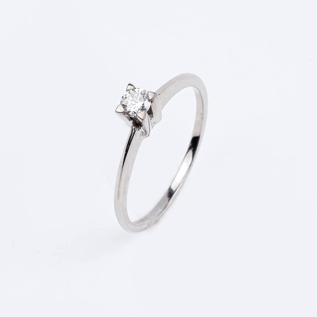 Anel solitário ouro branco com um diamante de 12 pontos no centro e 4 garras no apoio do diamante no aro.
