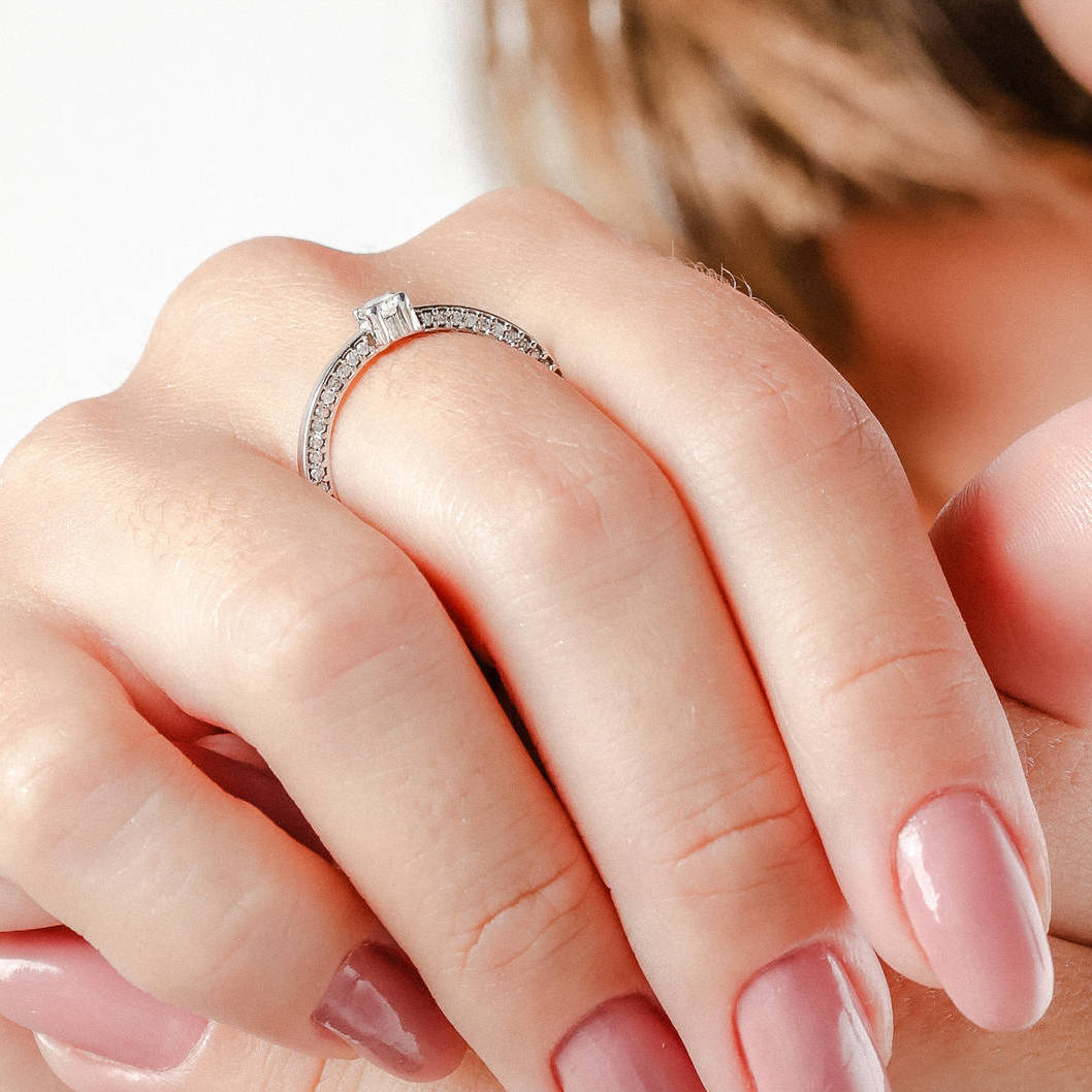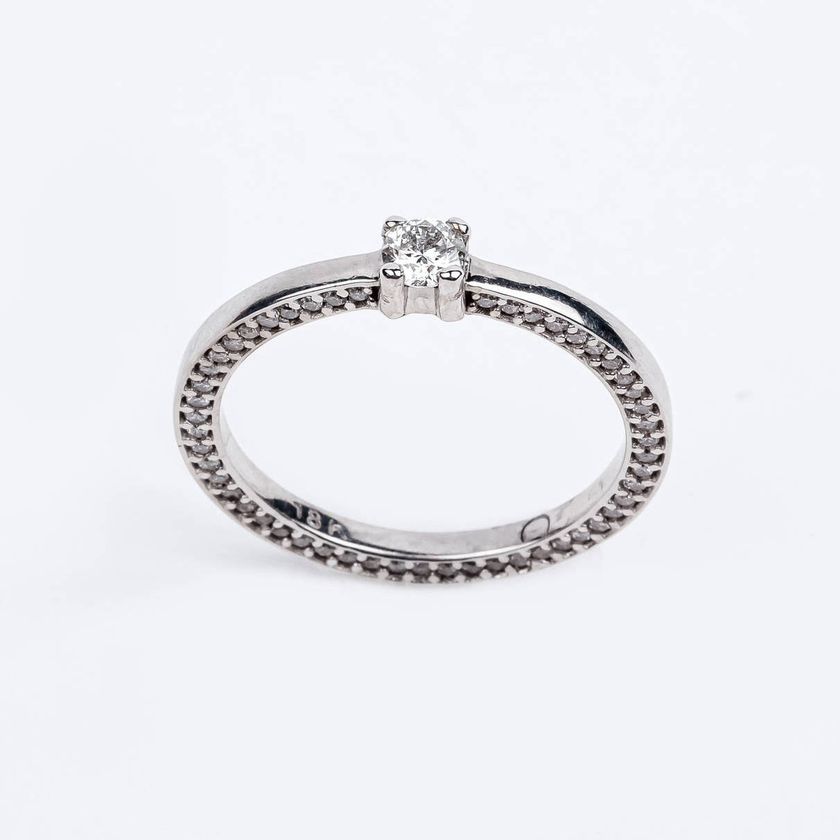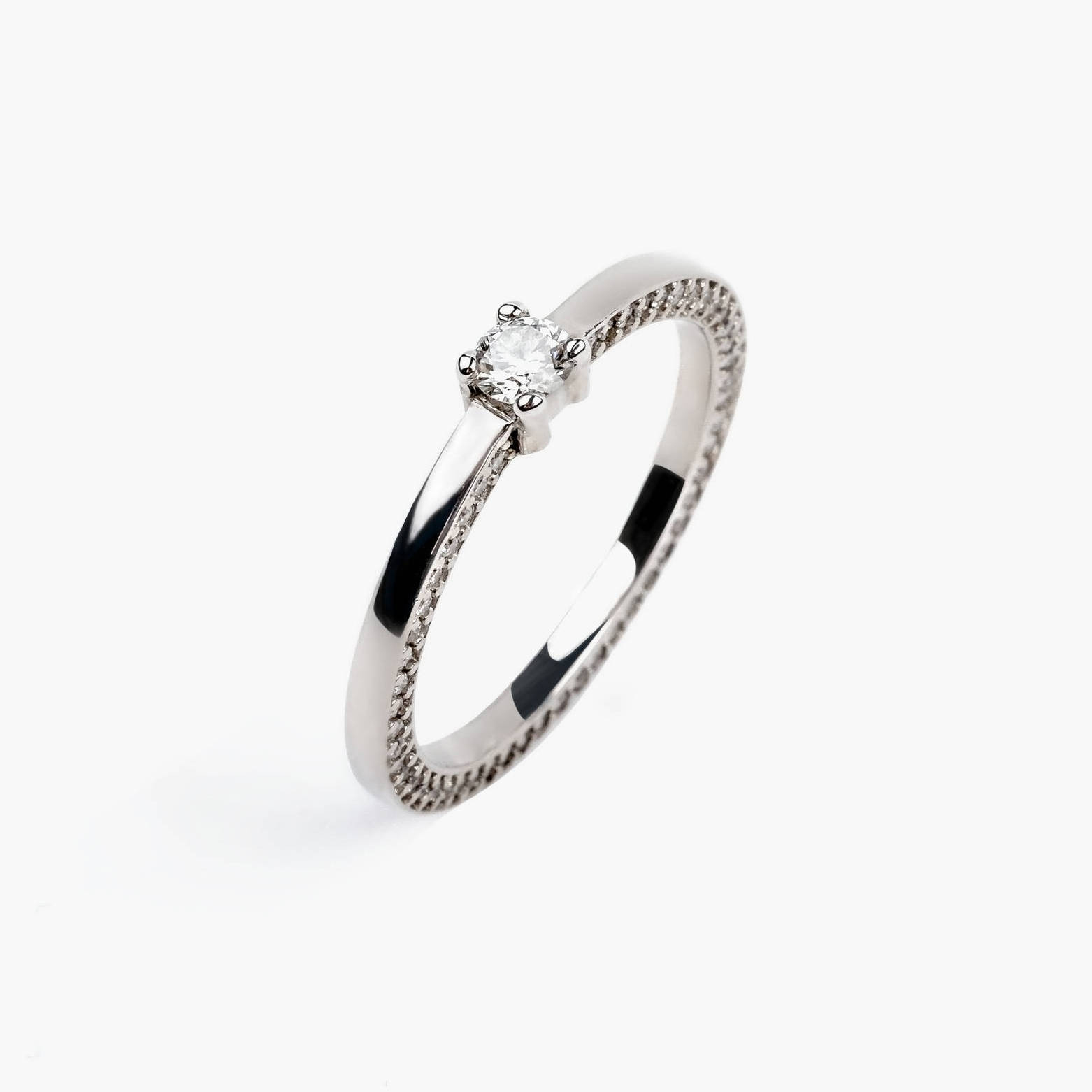 Anel solitário ouro branco com total de 122 pontos de diamantes cobrindo a lateral completa do anel e um diamante central. Diamante central com 19 pontos.