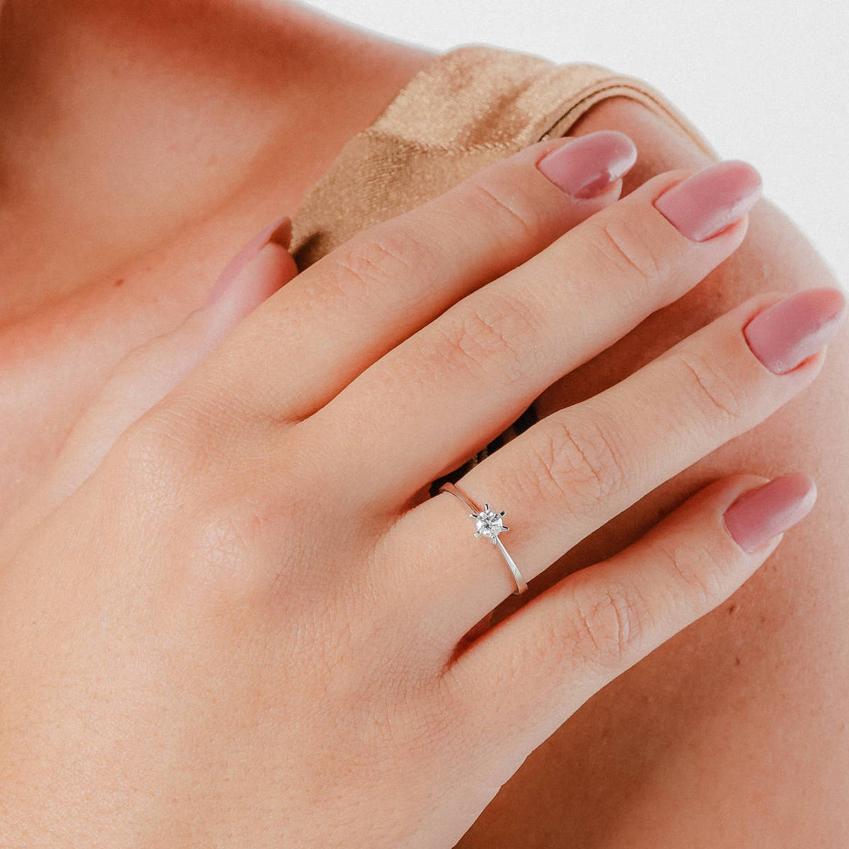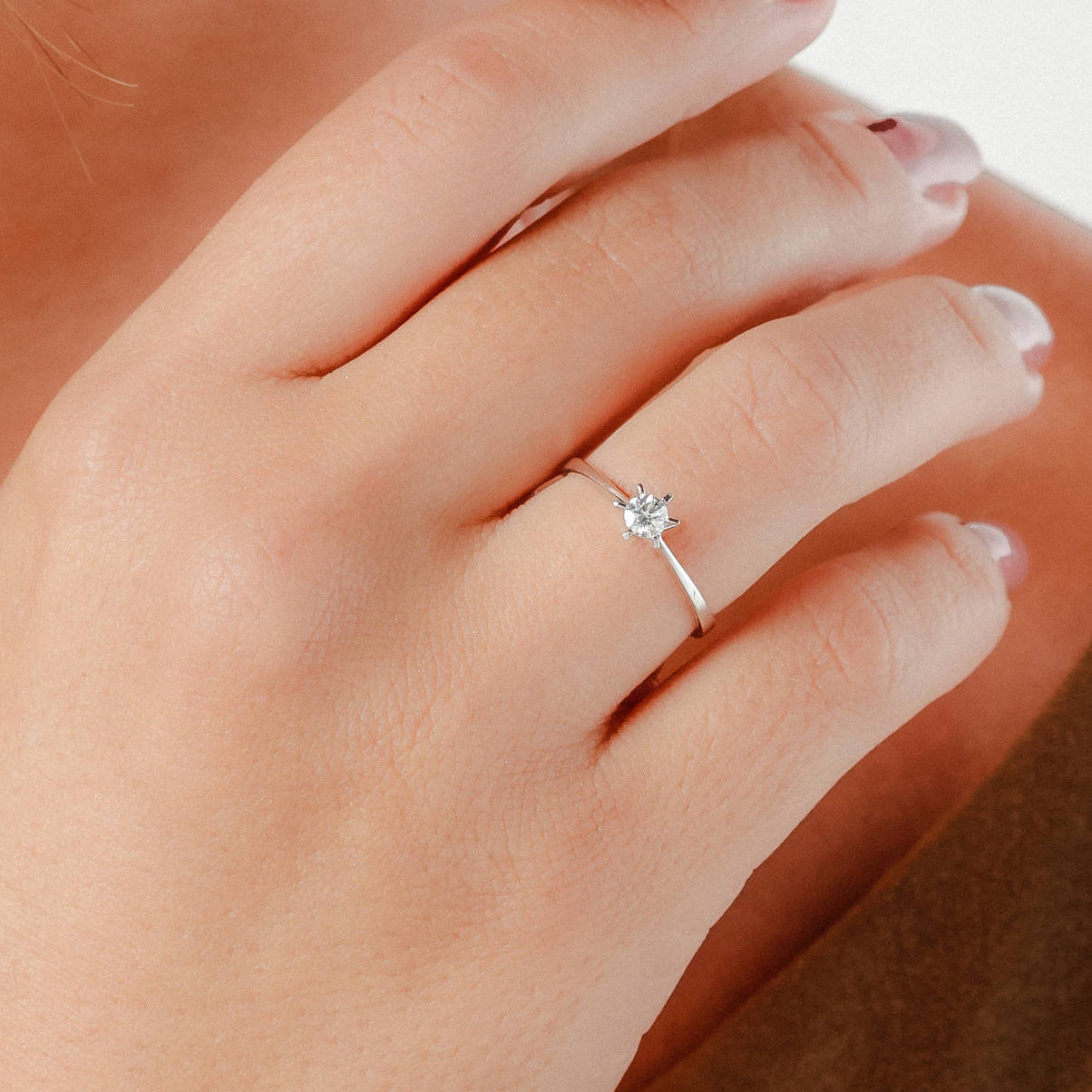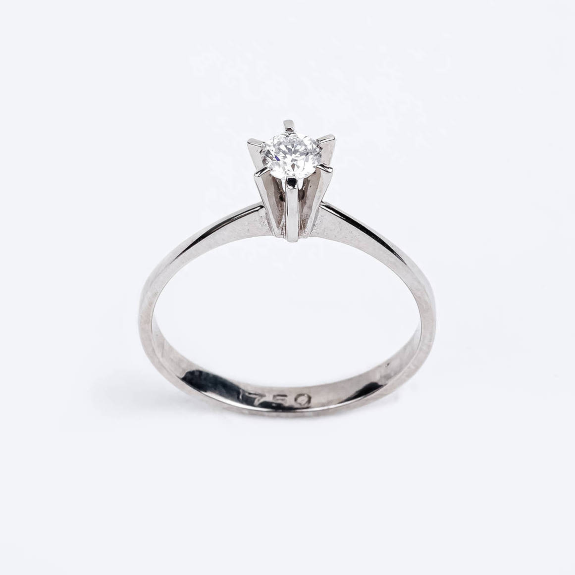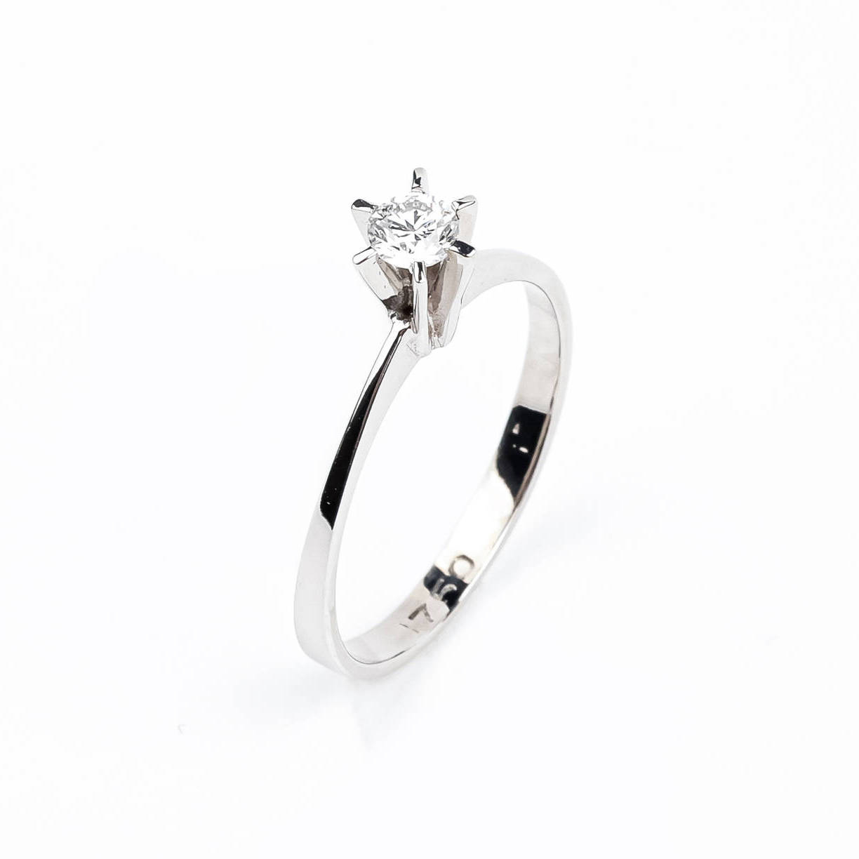 Anel solitário ouro branco com um diamante de 20 pontos no centro e 6 garras no apoio do diamante no aro.