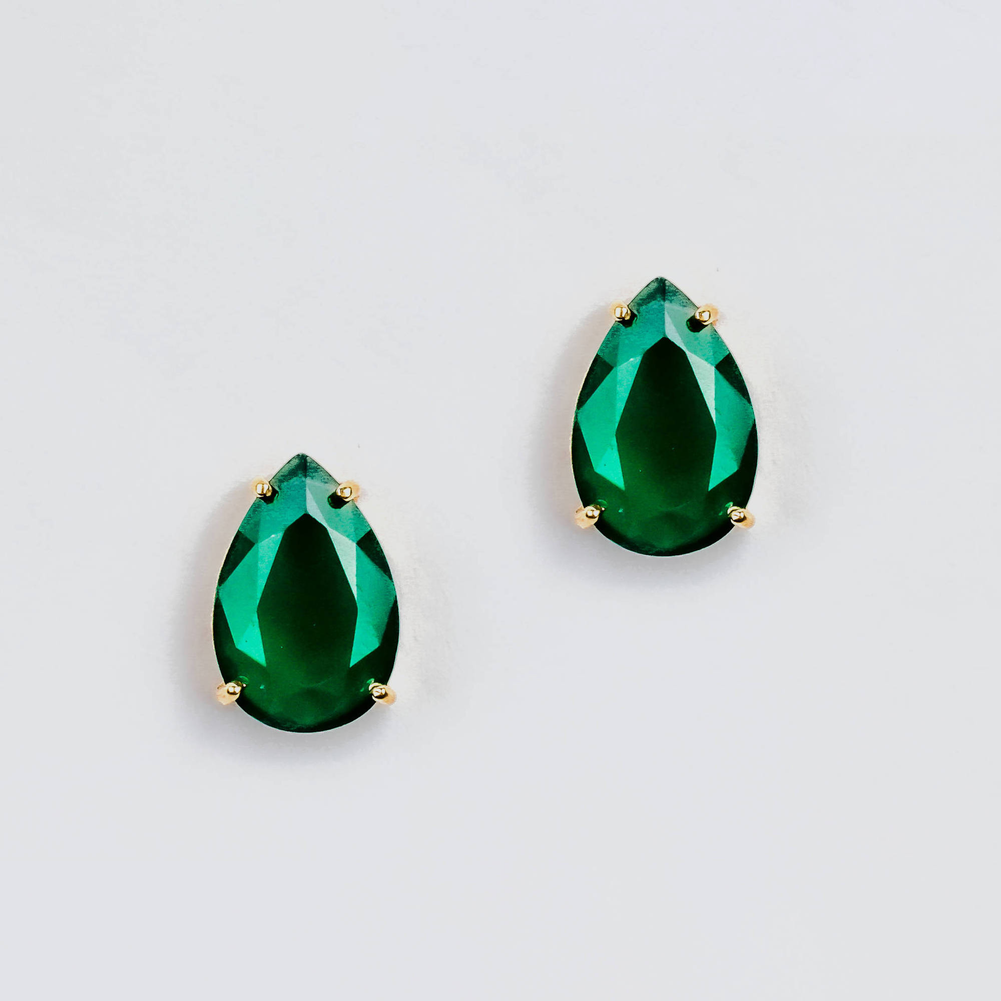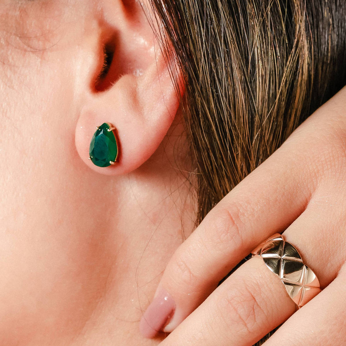 Brinco ouro amarelo formato gota com nefrita verde.