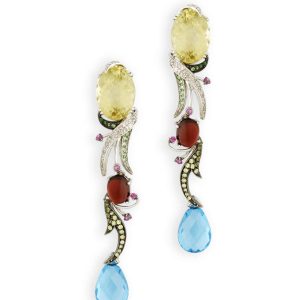 BRINCO OURO AMARELO 18K PENDURADO MÉDIO COM DUAS GOTAS EM TOPÁZIO ROSA PINK E UMA SAFIRA BRANCA PEQUENA NO MEIO