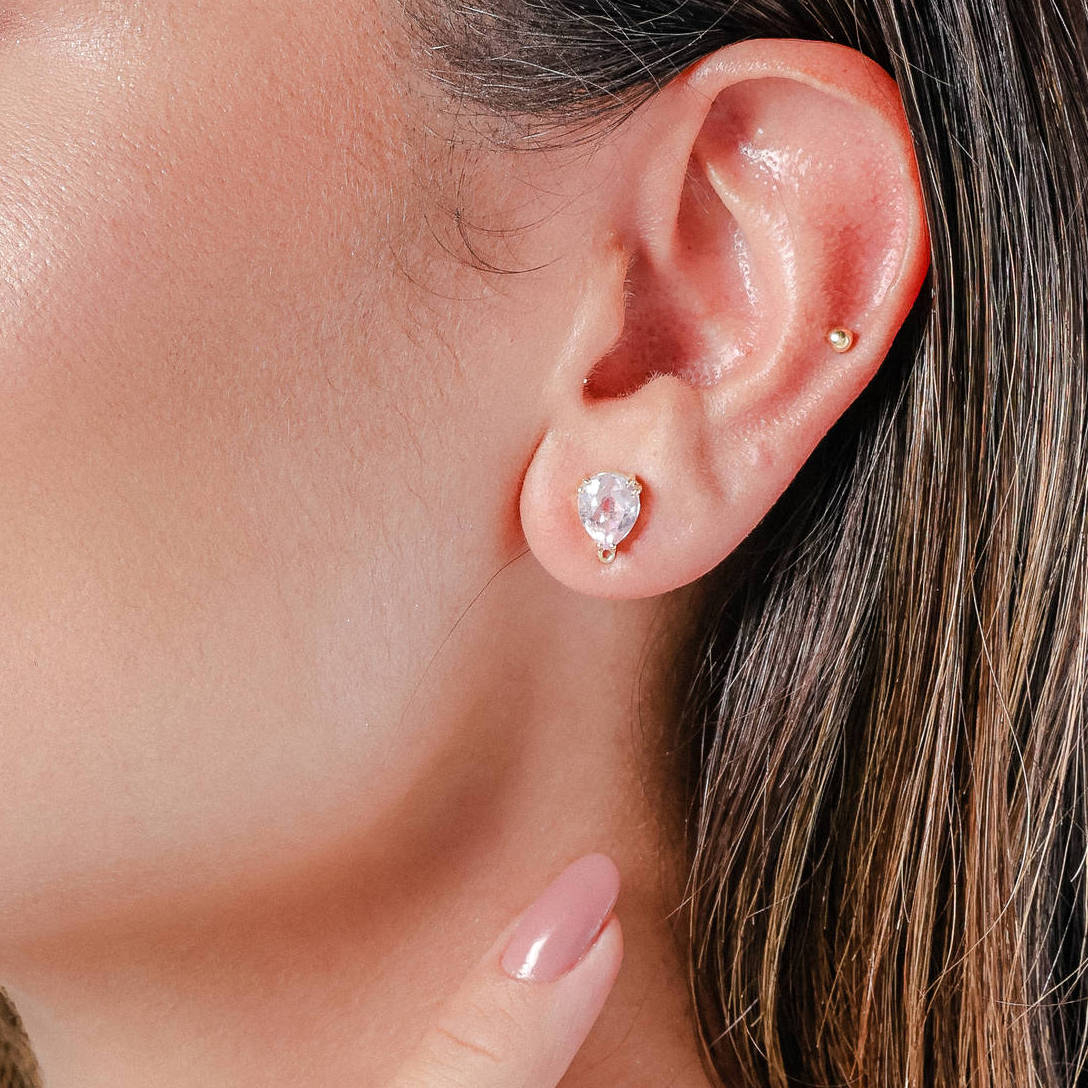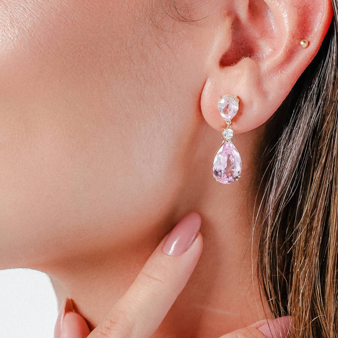 Brinco ouro amarelo com topázios lapidação gota rosa claro e safira branca entre as gotas.