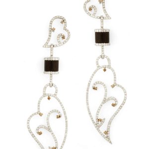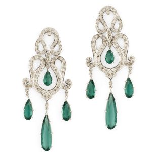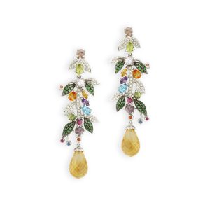 BRINCO OURO AMARELO 18K COM SAFIRA BRANCA PEQUENA FORMATO GOTA, REDONDA NO MEIO AMETISTA PEQUENA E GOTA MÉDIA EM TOPÁZIO VERDE PENDURADA COM SAFIRAS BRANCAS EM VOLTA.