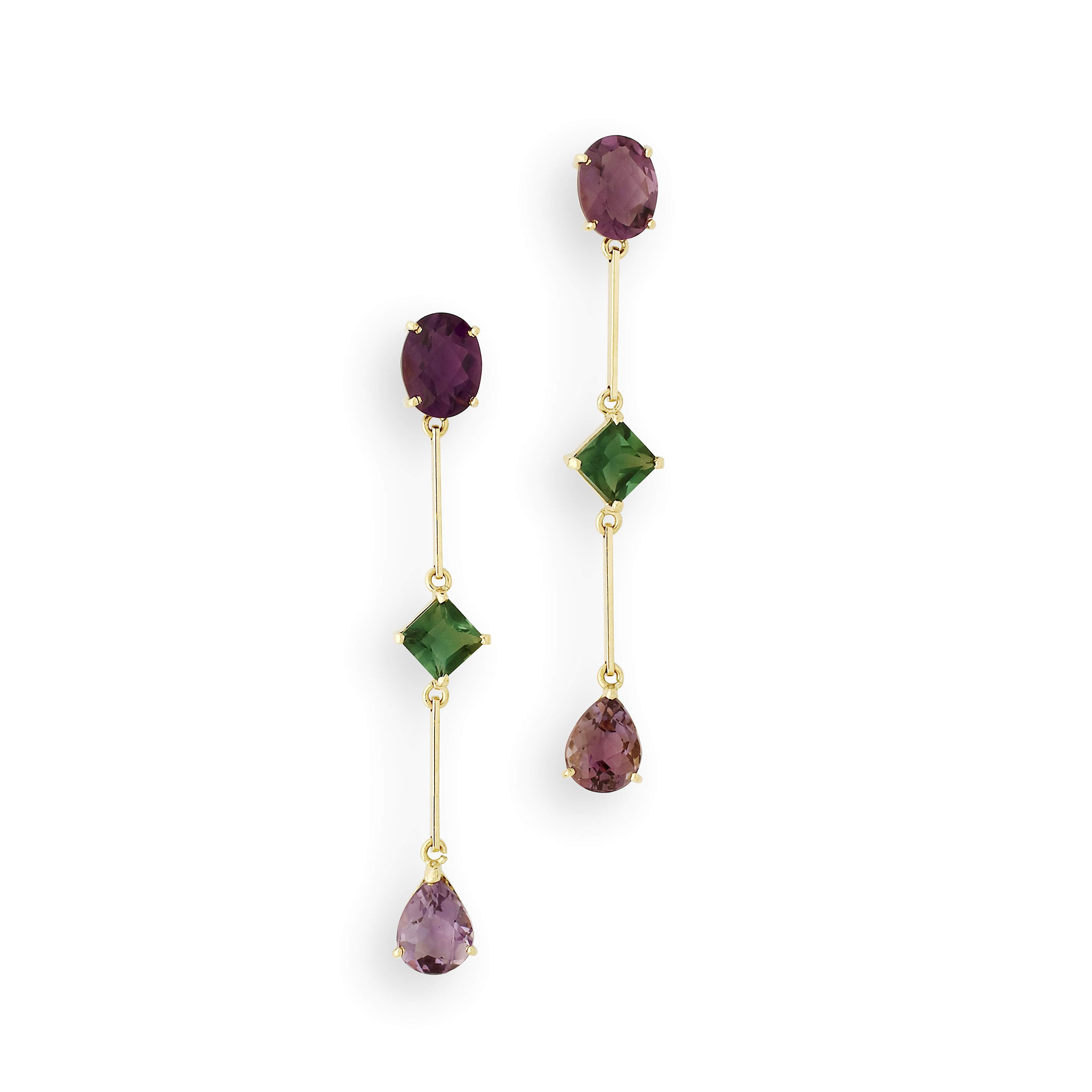 BRINCO OURO AMARELO 18K COM AMETISTA PEQUENA FORMATO GOTA, QUADRADA NO MEIO EM TOPÁZIO VERDE PEQUENA E PEDRA REDONDA PEQUENA AMETISTA PENDURADA
