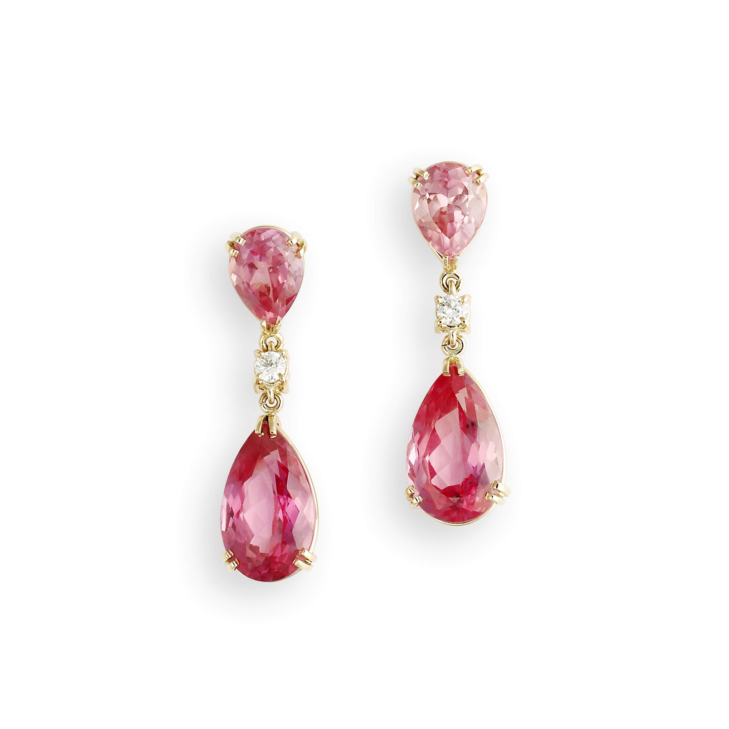 BRINCO OURO AMARELO 18K PENDURADO MÉDIO COM DUAS GOTAS EM TOPÁZIO ROSA PINK E UMA SAFIRA BRANCA PEQUENA NO MEIO