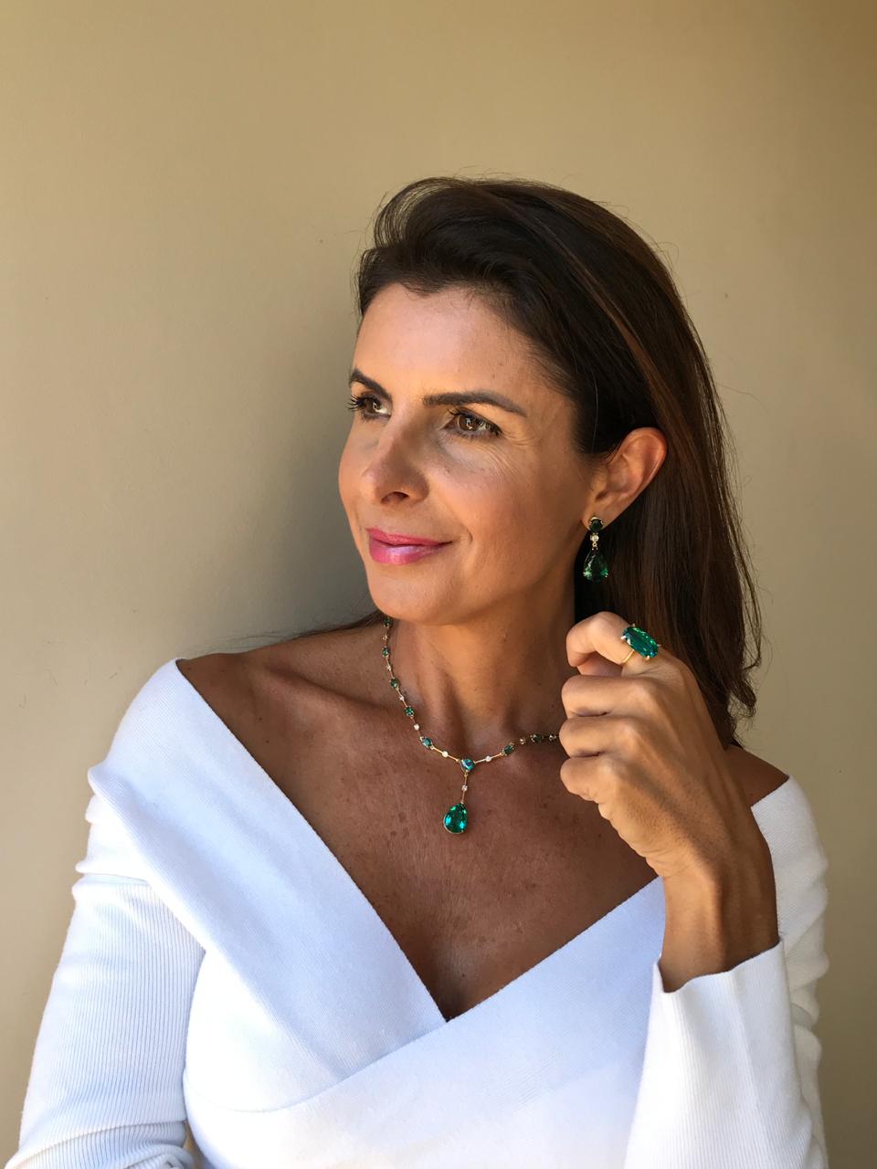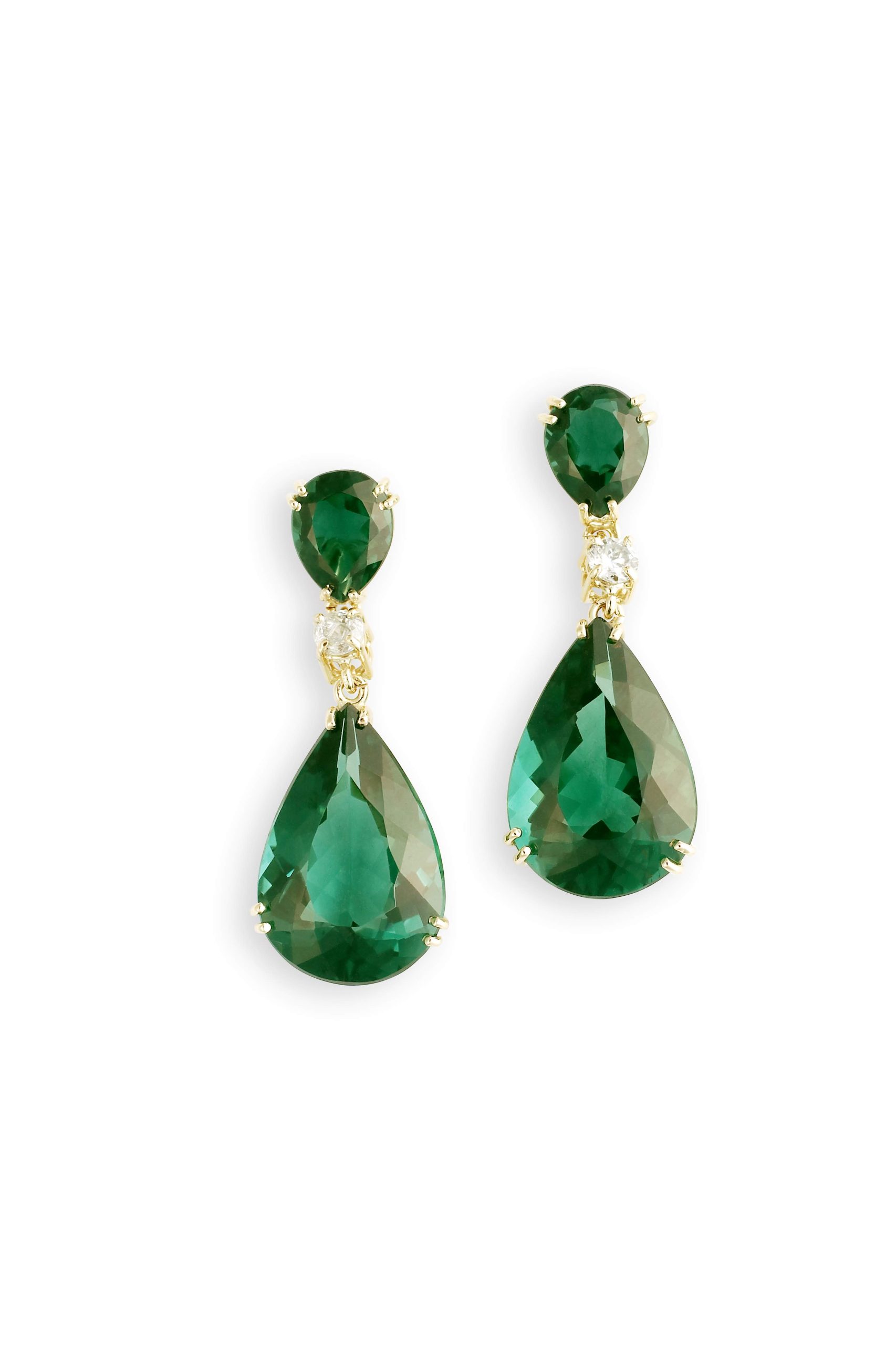 BRINCO OURO AMARELO 18K PENDURADO MÉDIO COM DUAS GOTAS EM TOPÁZIO VERDE E UMA SAFIRA BRANCA PEQUENA NO MEIO