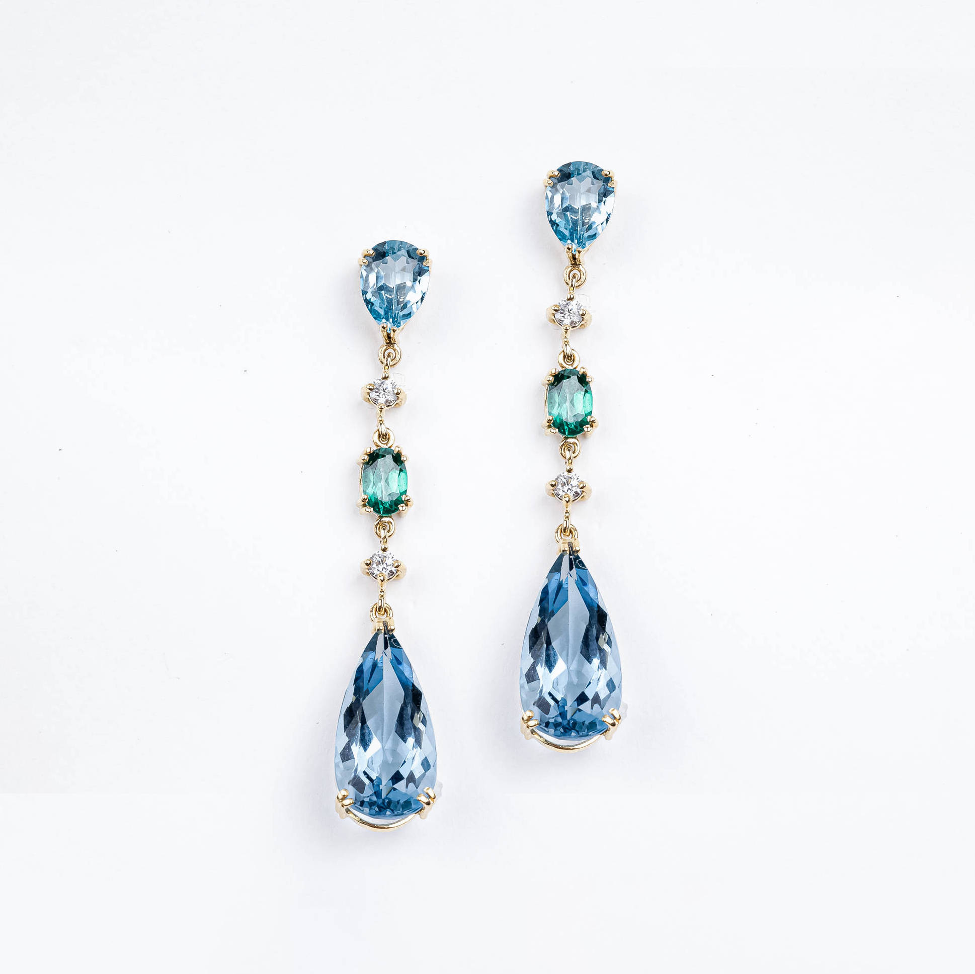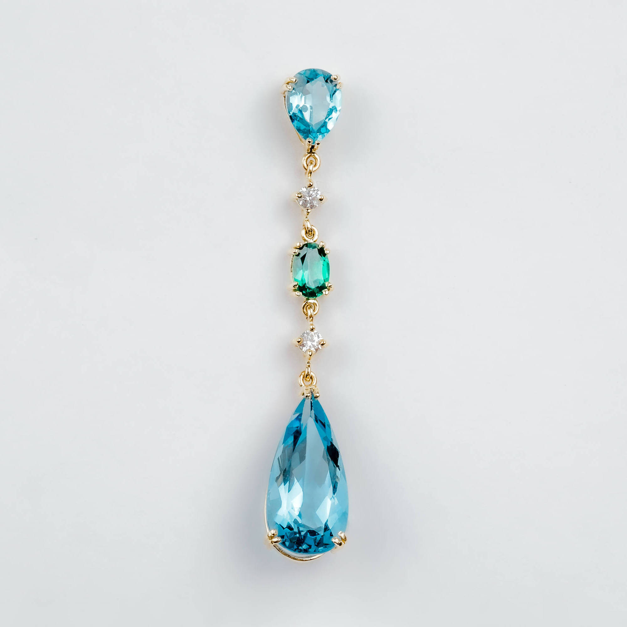 Brinco ouro amarelo com dois topázios formato gota azul, duas safiras brancas pequenas e um topázio verde formato oval.