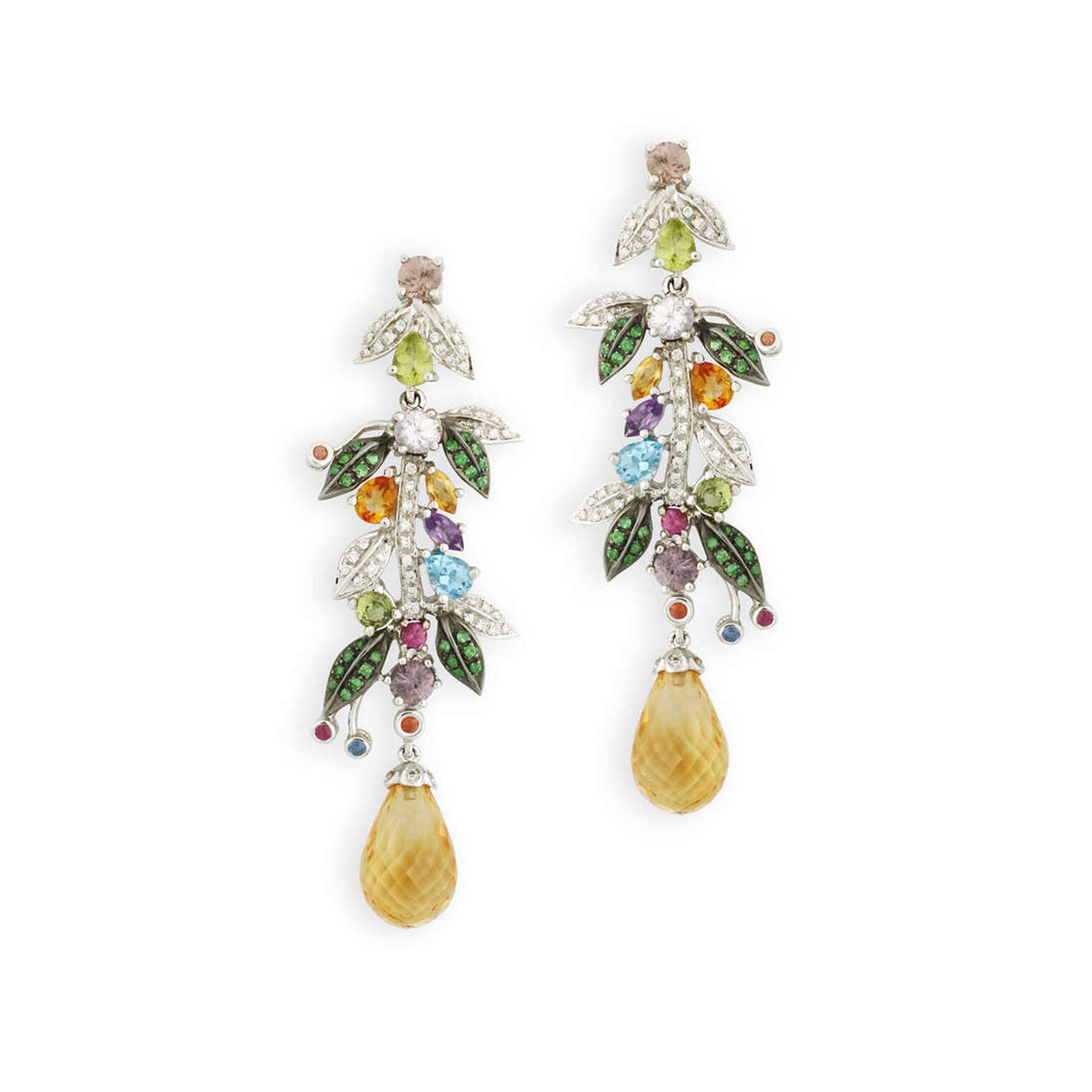 BRINCO OURO BRANCO 18K FORMATO GALHO COM FOLHAS DE DIAMANTES PENDURADOS COLORIDOS E UMA GOTA NA PONTA.