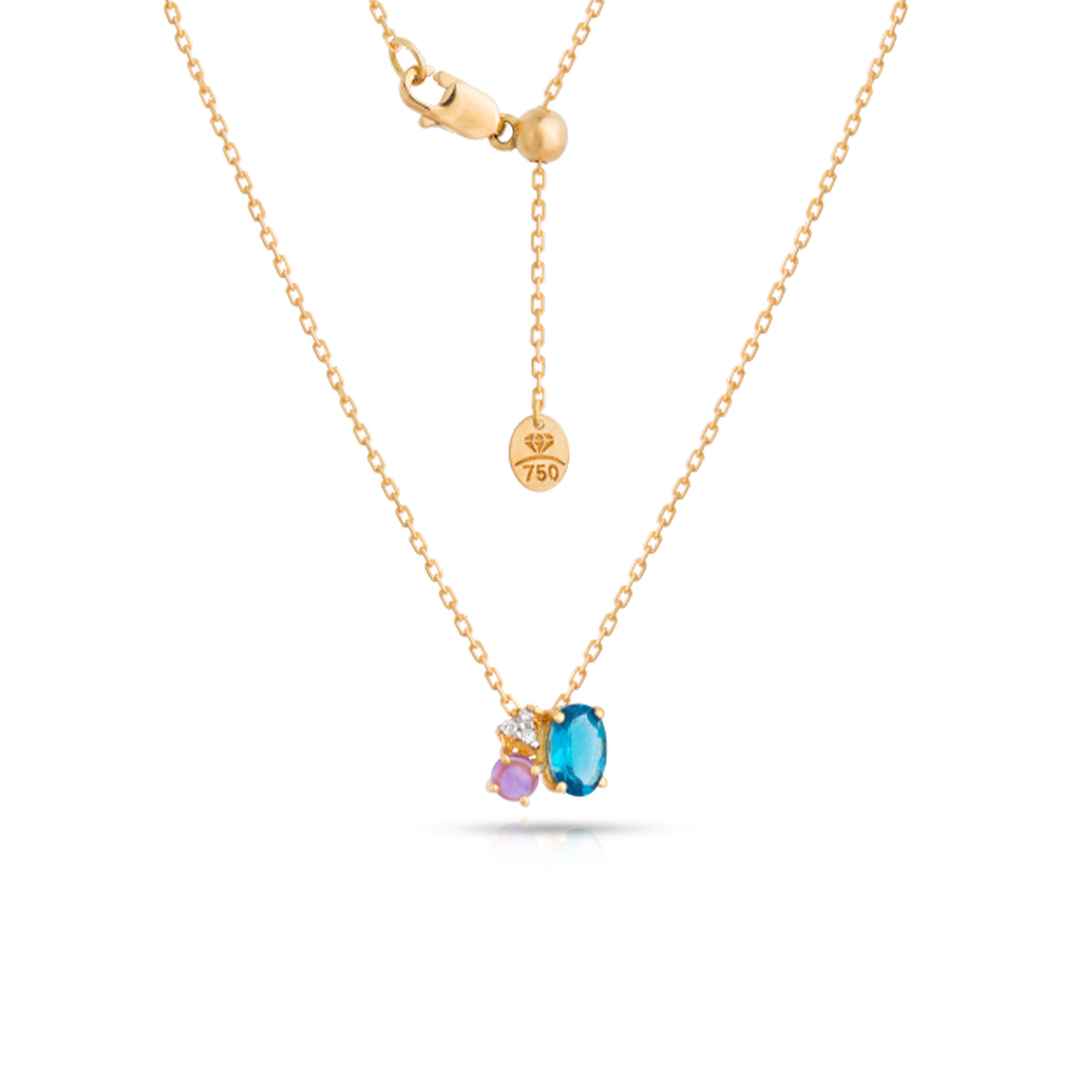 Colar ouro amarelo 18K com diamantes, topázio London Blue e ametista. Comprimento médio do colar: 45cm.