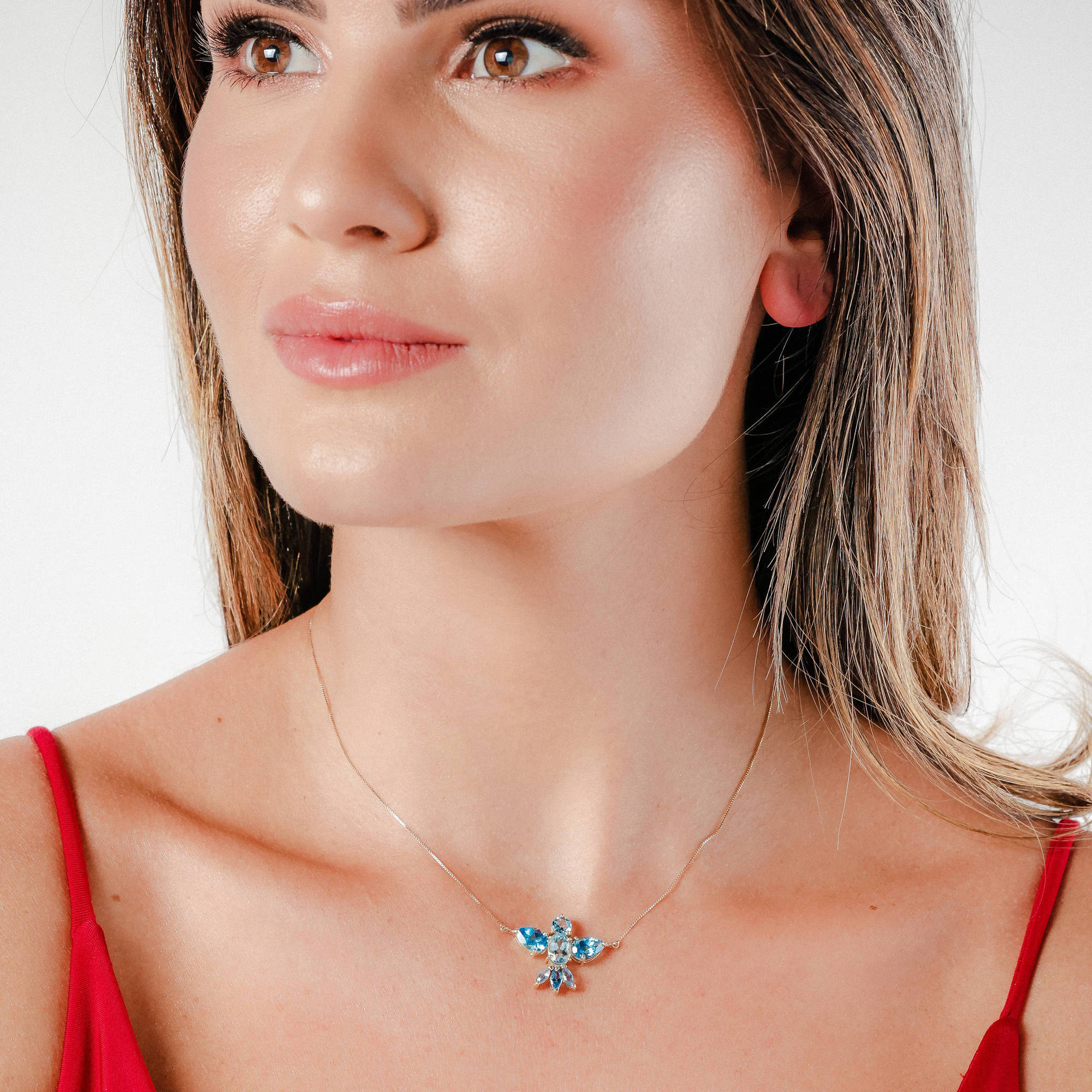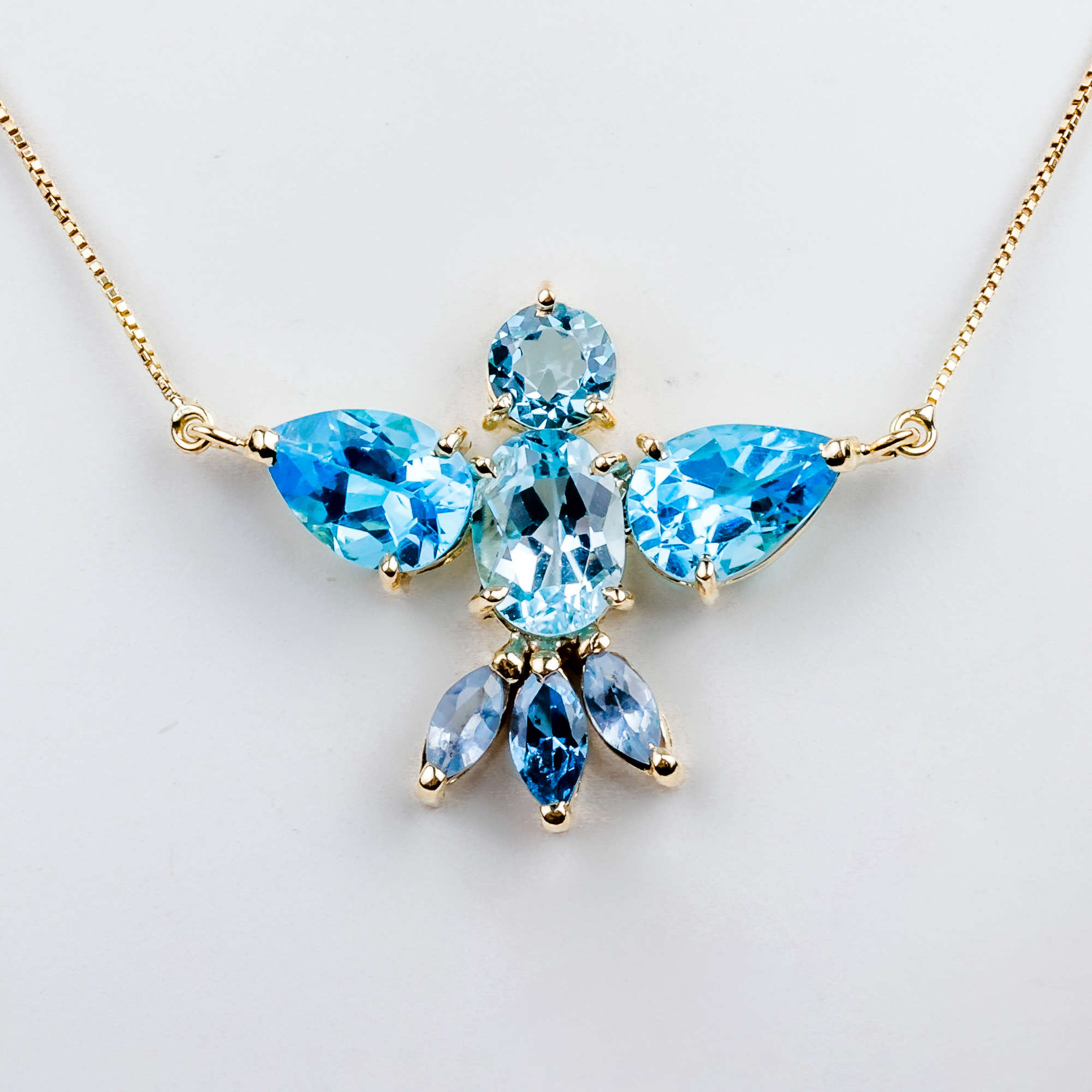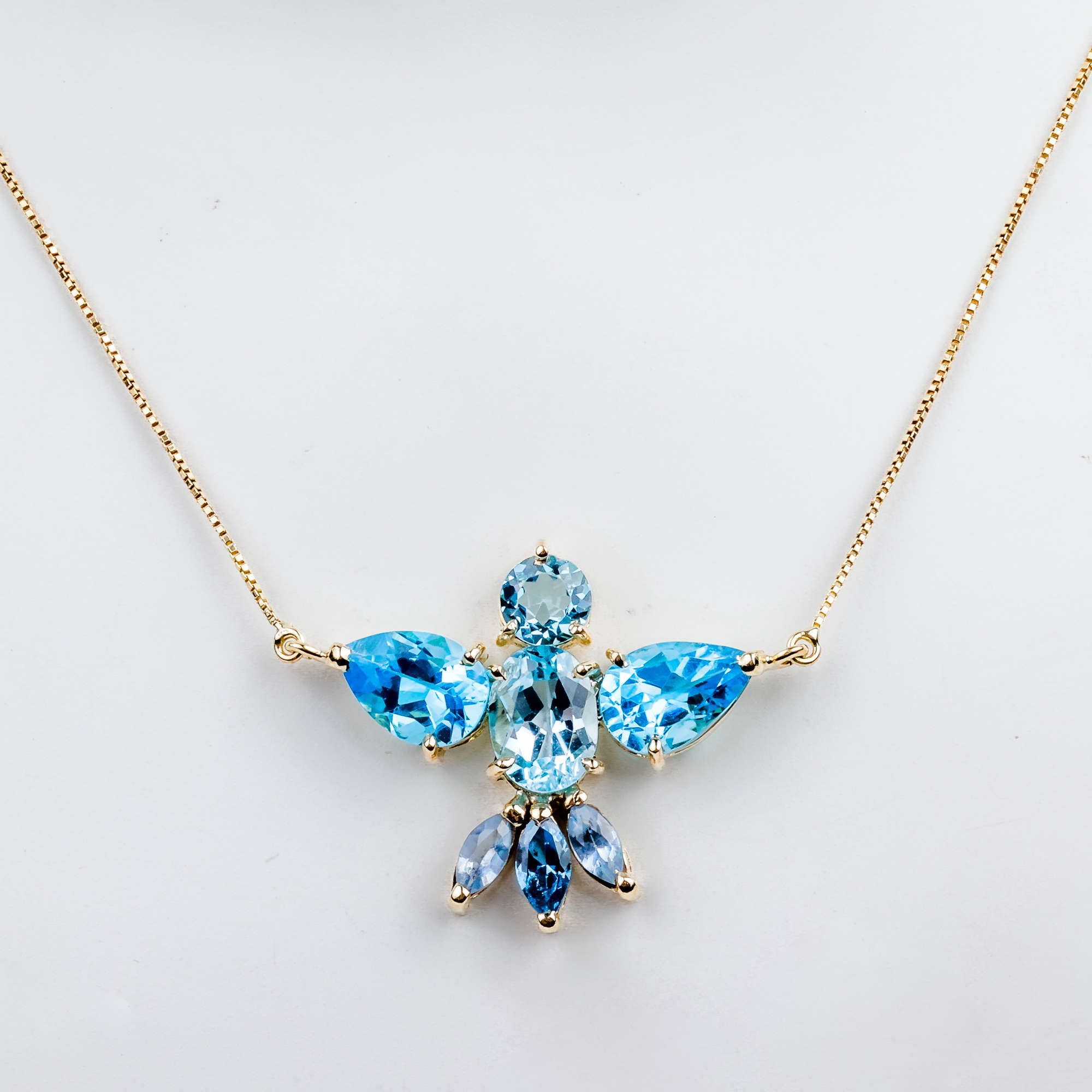 Colar ouro amarelo com fio veneziano de 42cm e pingente divino espírito santo com topázio azul.