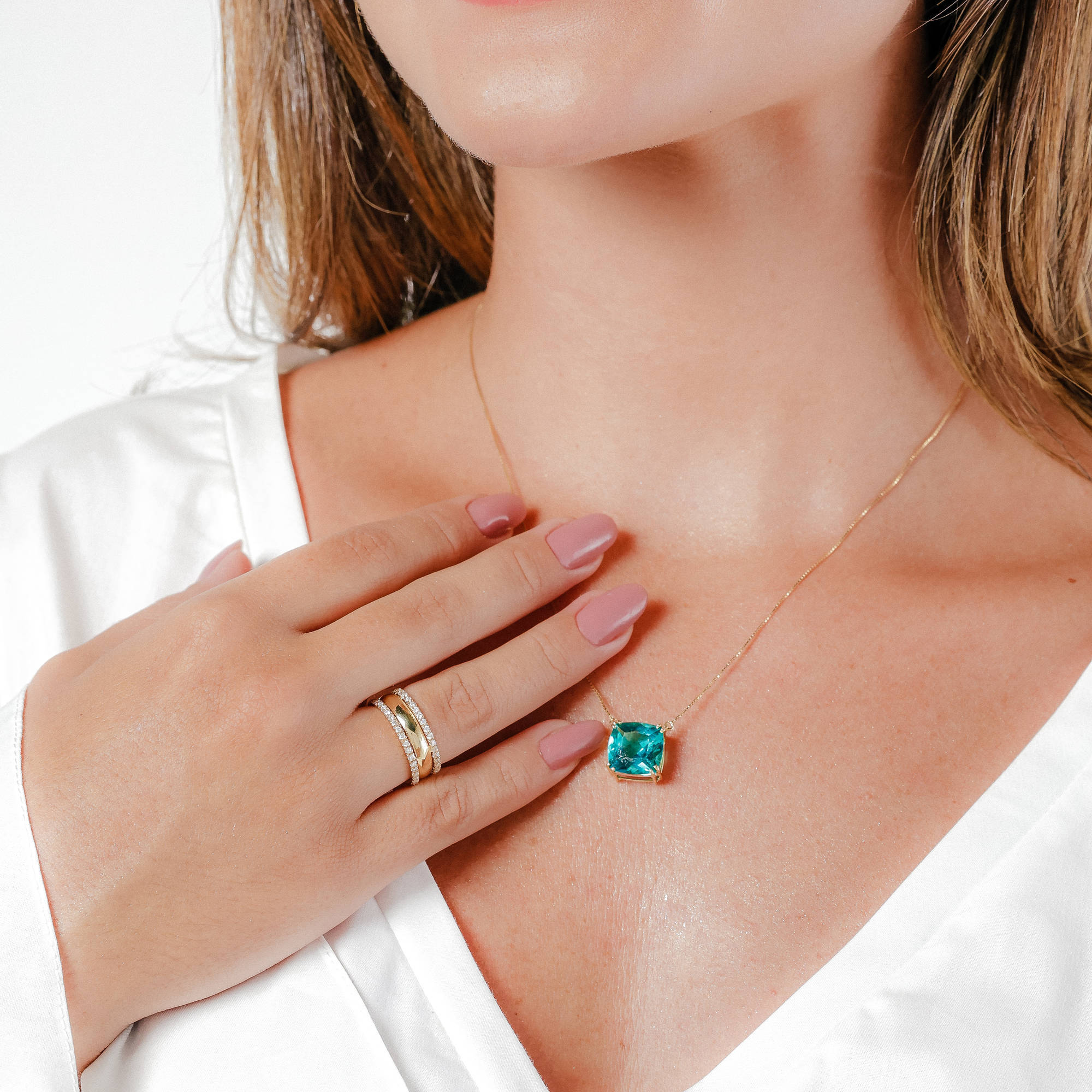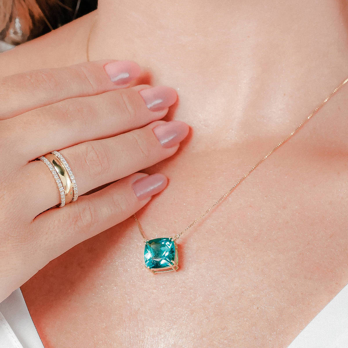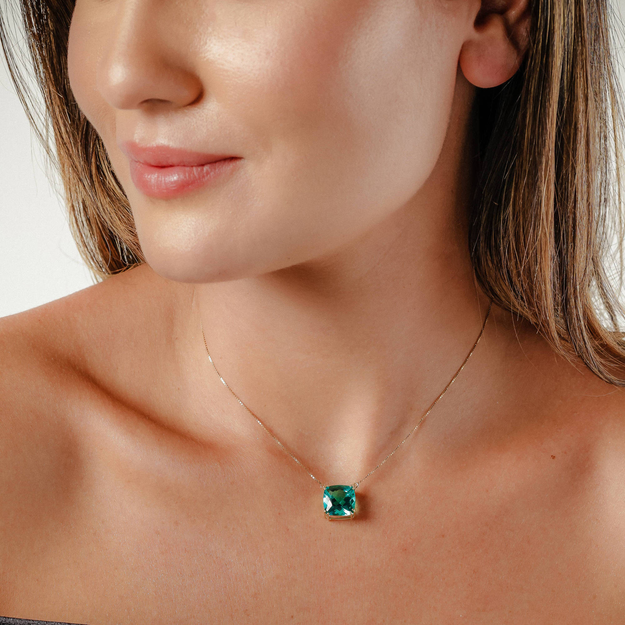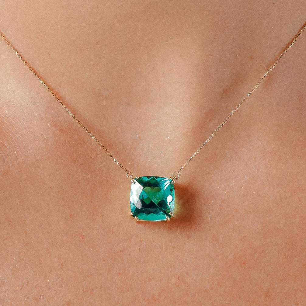 Colar ouro amarelo fio veneziano 45cm e pingente em topázio verde quadrado.