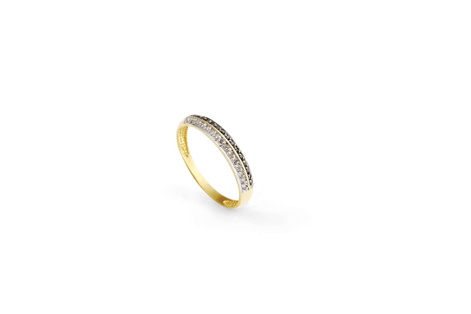 MEIA ALIANÇA OURO AMARELO 18K CRAVEJADO COM 15 DIAMANTES TRANSPARENTES E 15 DIAMANTES NEGROS NA PARTE SUPERIOR