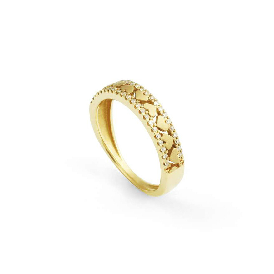 MEIA ALIANÇA OURO AMARELO 18K COM CORAÇÕES EM OURO AMARELO PEQUENOS NO MEIO E CRAVEJADO NA LATERAL DA PARTE SUPERIOR COM 46 DIAMANTES