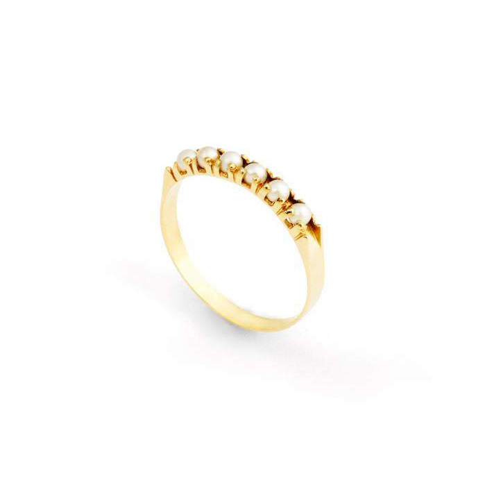 MEIA ALIANÇA OURO AMARELO 18K CRAVEJADA NA PARTE SUPERIOR COM 6 PÉROLAS PEQUENAS